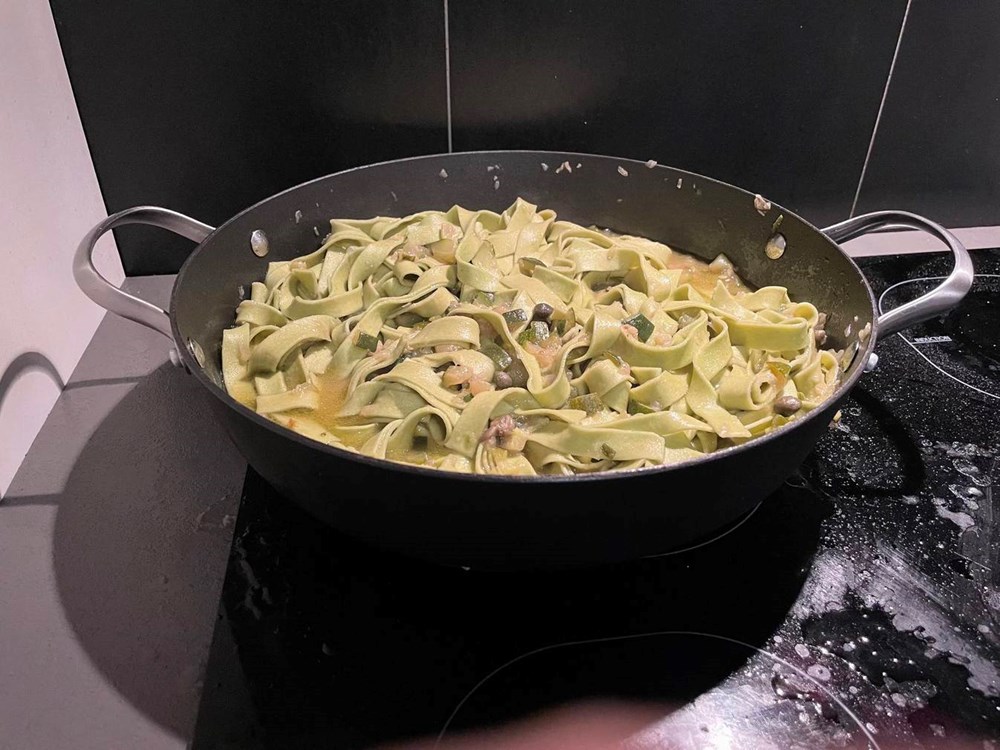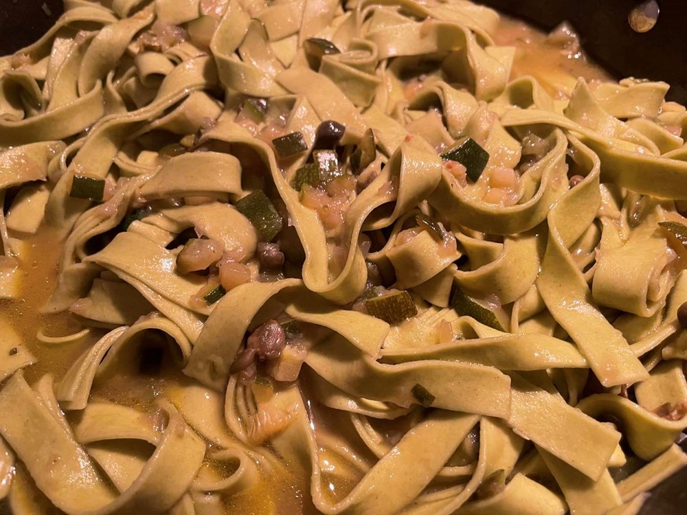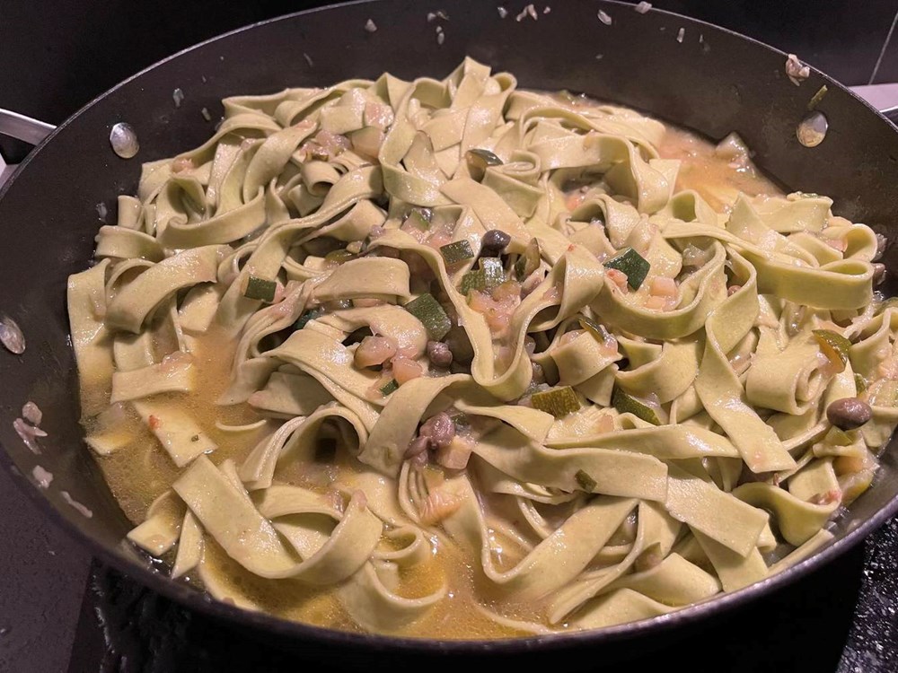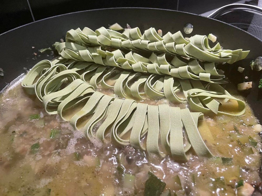 Kada povrće i temeljac zakipe, u poluduboku tavu s temeljcem i povrćem dodamo tagliatelle te ih uz konstantno ali lagano miješanje kuhamo još nekih 8 do 10 minuta dok ne budu kuhane "al dente", zatim tavu maknemo s izvora topline.
