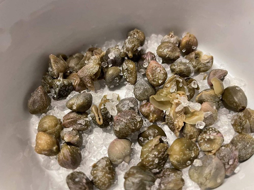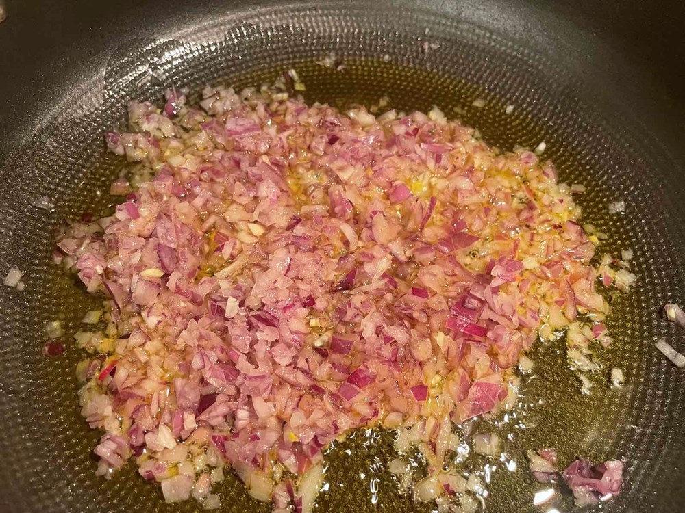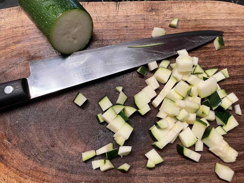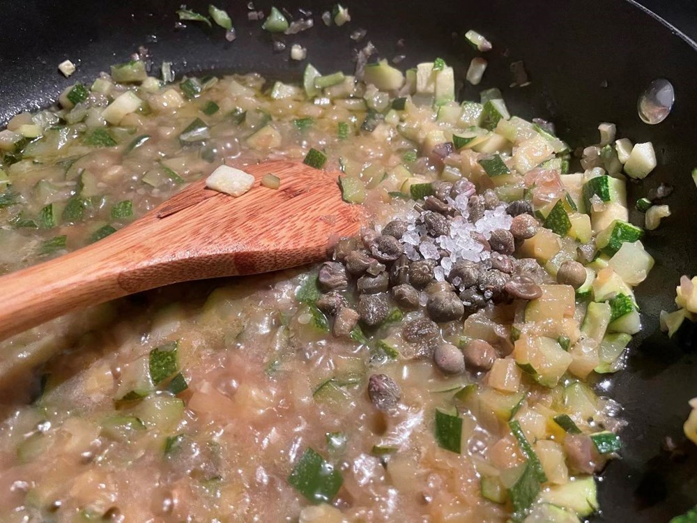 Luk narezan na sitne kockice, jušnu žlicu kapara i 0,5 kg tikvica narezane na kockice veličine graška dinstamo na maslinovom ulju u poludubokoj tavi na srednje jakoj temperaturi.