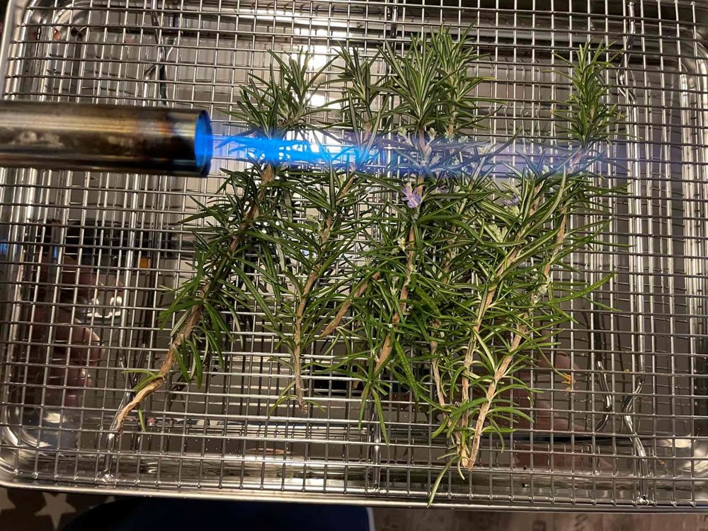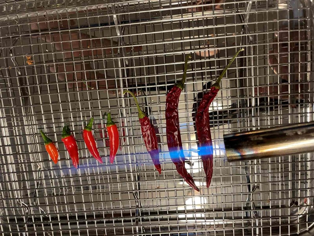 Brenerom (ako nemate brener, možete vani ili na balkonu na roštilju) izgoriti 2 chili paprike i 15 slatkih feferona, i to izgoriti skroz dok ne postanu crni ugalj. (Važna napomena: chili papriku palite isključivo vani, i ne pretjerujte u količinama, jer dim chilli paprike može izazvati efekt vrlo sličan suzavcu i nadražiti vam dišne organe). Isto to ponovite sa grančicama od eužmarina. Taj nam je ugalj potreban za crnu boju umaka a i dati će poseban okus umaku.