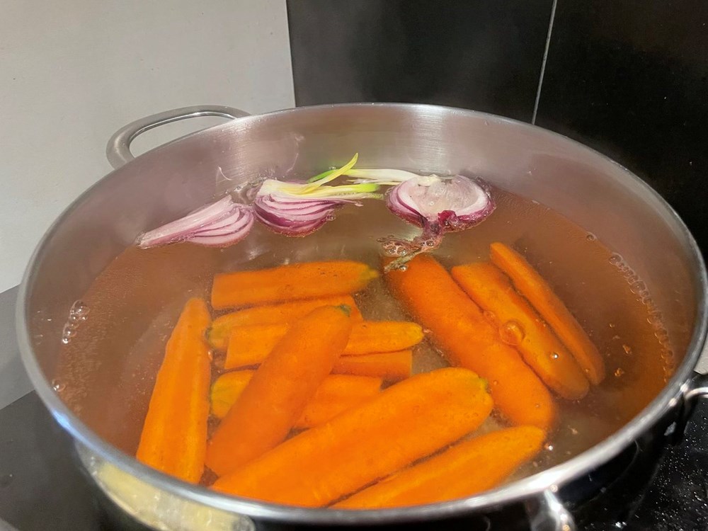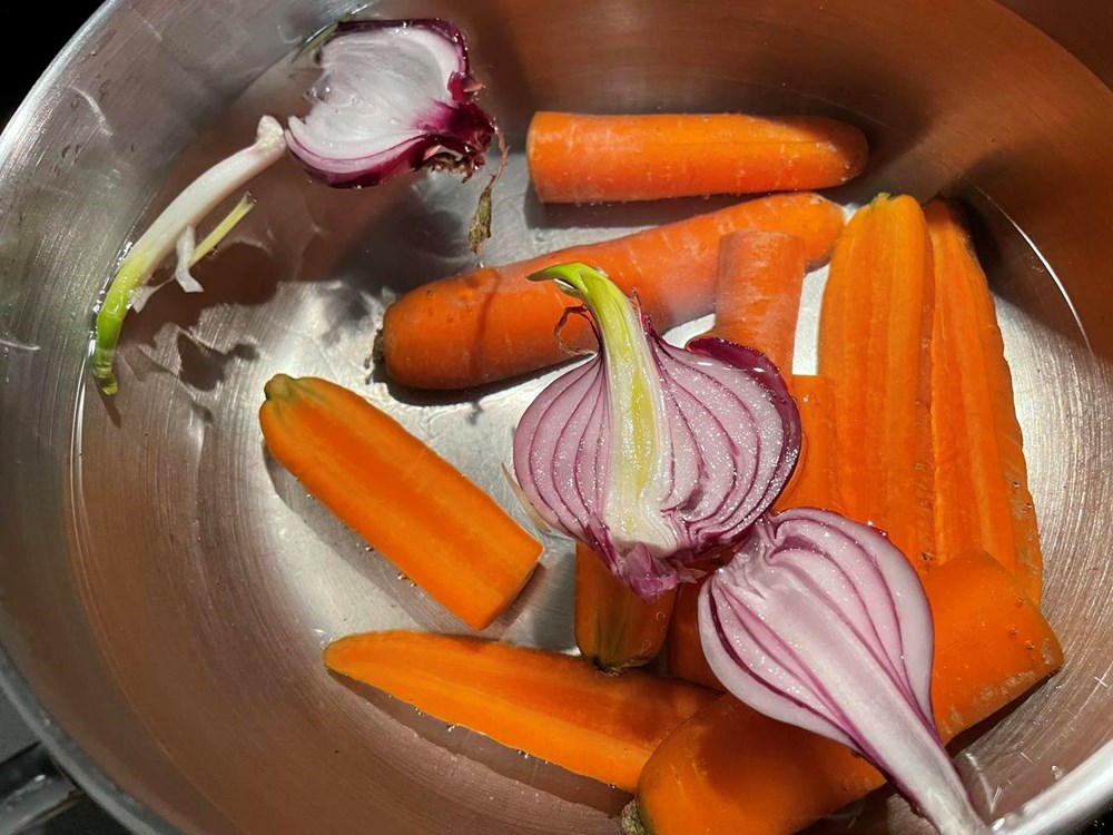 Izrezati glavicu luka na četvrtine a mrkve na polovice, pa ih staviti u 1,5 l kipuće vode da se kuhaju 30-ak minuta. Nakon toga vaš temeljac je spreman.