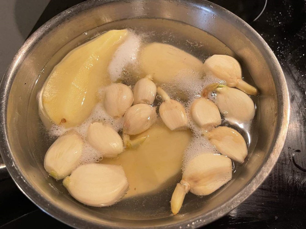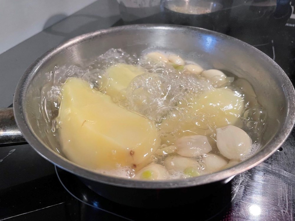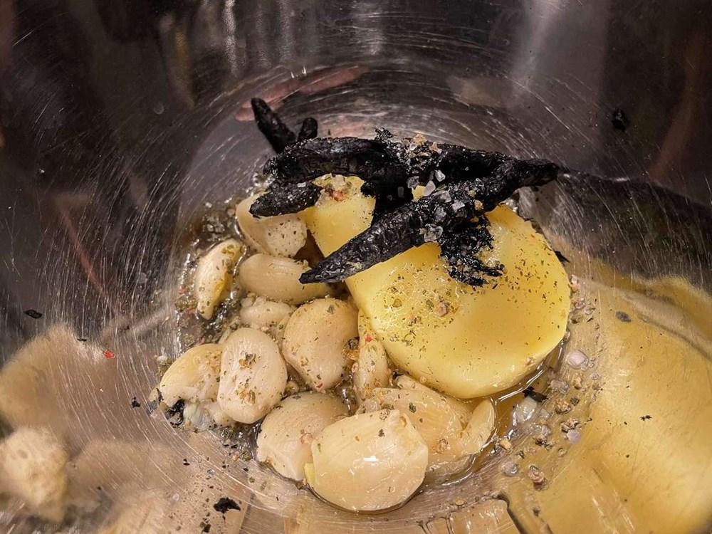 Prokuhajte krumpir kojem ste ogulili koru i očišćeni češnjak u malo kipuće vode nekih 20-ak minuta. U okrugloj zdjeli, štapnim mikserom dobro izmiksajte kuhani krumpir, češnjak, čajnu žličicu soli, prstohvat friško samljevenog zelenog papra, jušnu žlicu meda, jušnu žlicu maslinovog ulja i zagorene crne chilli paprike i ružmarin koje smo napravili plamenom brenera. Miksajte dok smjesa ne postane gusta i kompaktna (gustoća nešto poput majoneze).