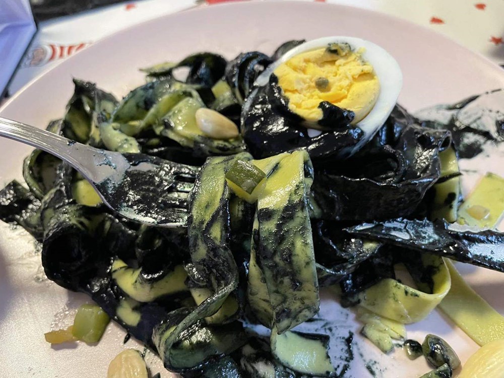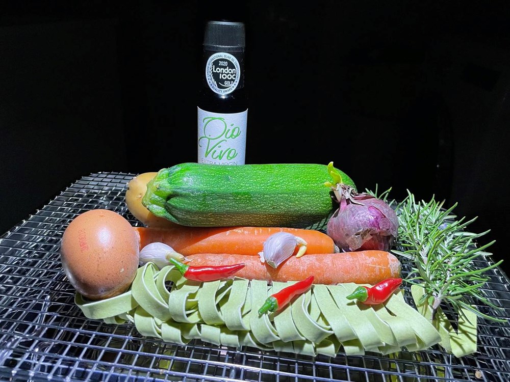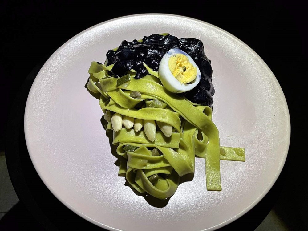 Velikom vilicom zarolamo tagliatelle iz poluduboke tave i položimo ih na ravan tanjur. Tagliatelle na tanjuru prelijemo s dvije velike žlice povrtnog umaka koji se dinstao s tagliatellama. Jednu stranu tagliatella prelijemo žlicom crnog umaka od chillija i ružmarina. Između crnog umaka i tagliatella s desne strane stavimo fetu tvrdo kuhanog jaja. U sredini ispod jaja linearno poslažemo 5 zrna prženog badema. Jelo se sada spremno za konzumiranje i uživanciju… Dobar tek! Vaš Outlaw…
