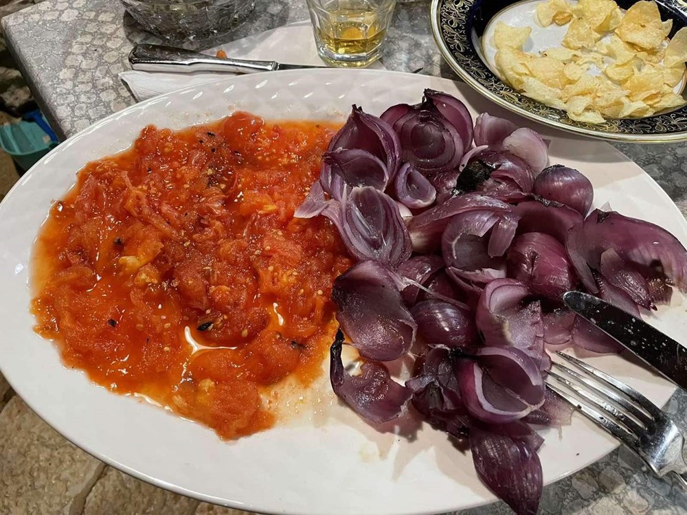 Kada su pomidori i luk pečeni (a to ćete primijetiti po tome što imaju smećkastu koricu naokolo i mekani su), izvadite ih iz vatre, stavite na veliku dasku za rezanje pa ogulite izgorenu vanjsku kožicu i ljuske od luka i pomidora.
