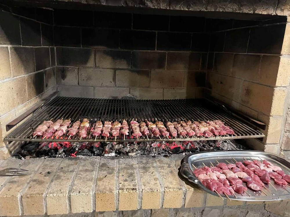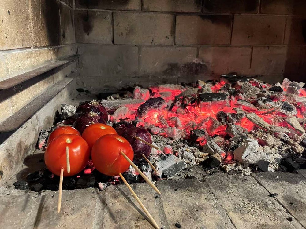 U roštilju zapalite vatru, kada drvo odgori i stvori se žar, na gradele stavite ražnjiće a paralelno s njima u žar sa strane stavite pomidor i luk, pa ga kad dobije koricu i bude pečen okrenite na drugu stranu.
