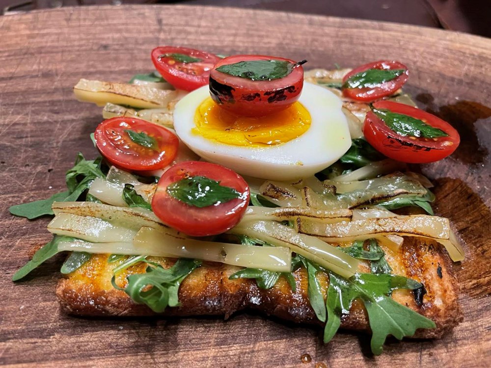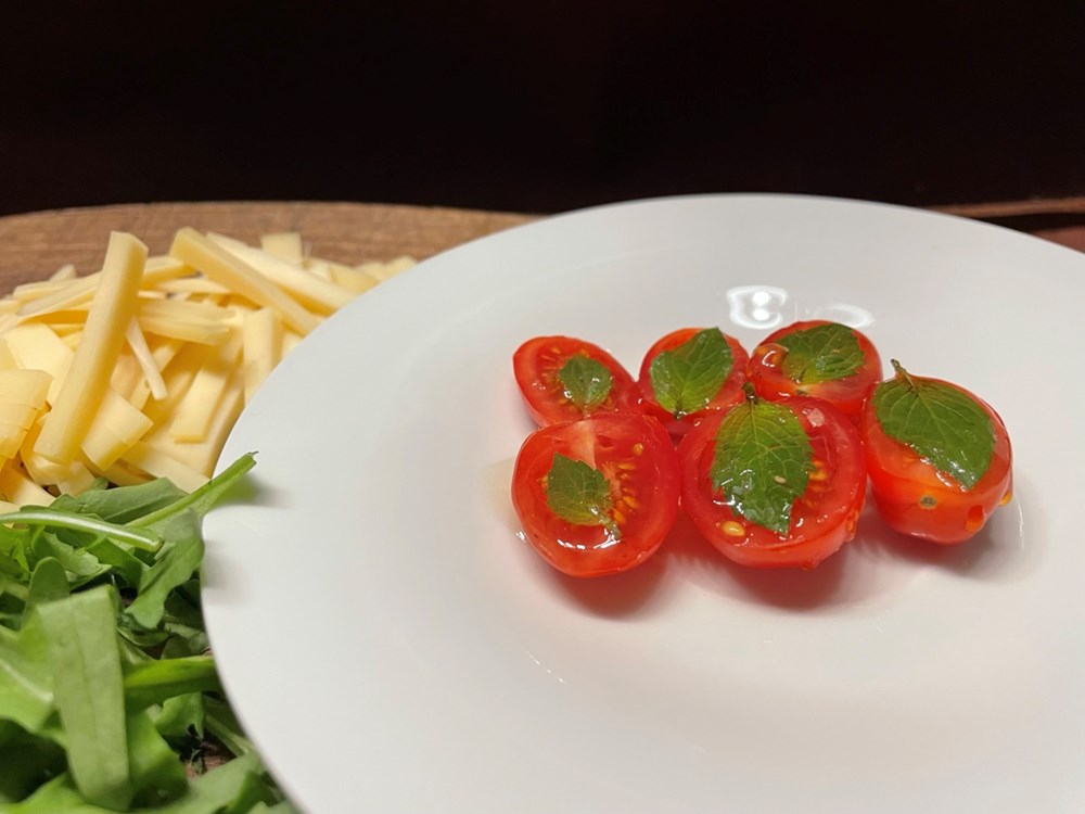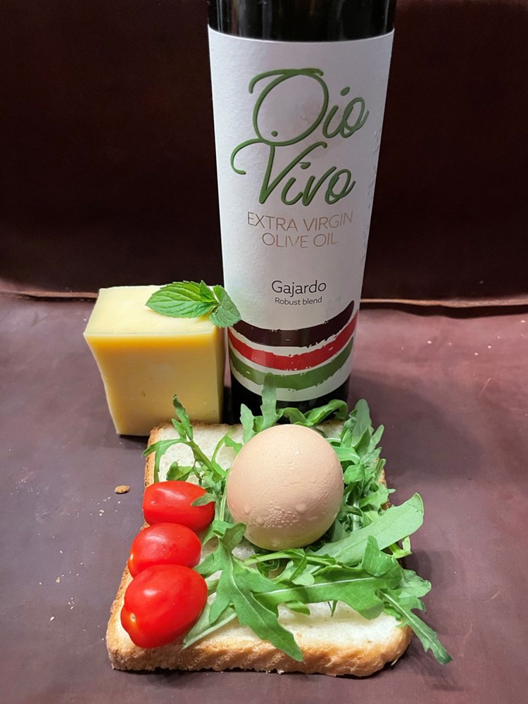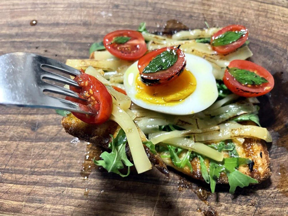 Ostale polovice cherry pomidora postavimo pomalo po površini tosta to jest po trakicama sira. Cijelu površinu tosta, listiće sira, rokulu, pomidore i jaje lagano prelijemo maslinovim uljem.