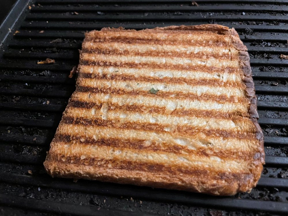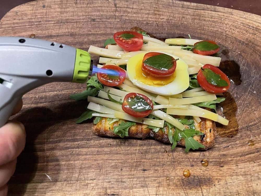 Zatim uzmemo džepni brener kojeg možete kupiti u svakoj većoj butigi i ponekom manjem kiosku za dvadesetak kuna, pa s njime lagano s par centimetara udaljenosti prolazimo po površini pomidora sve dok med ne zakipi (a to će se desiti za cca 7 do 10 sekundi) onda plamenom prođemo po trakicama sira sve dok ih ne rastopimo… i napokon naš je toast spreman za konzumaciju…