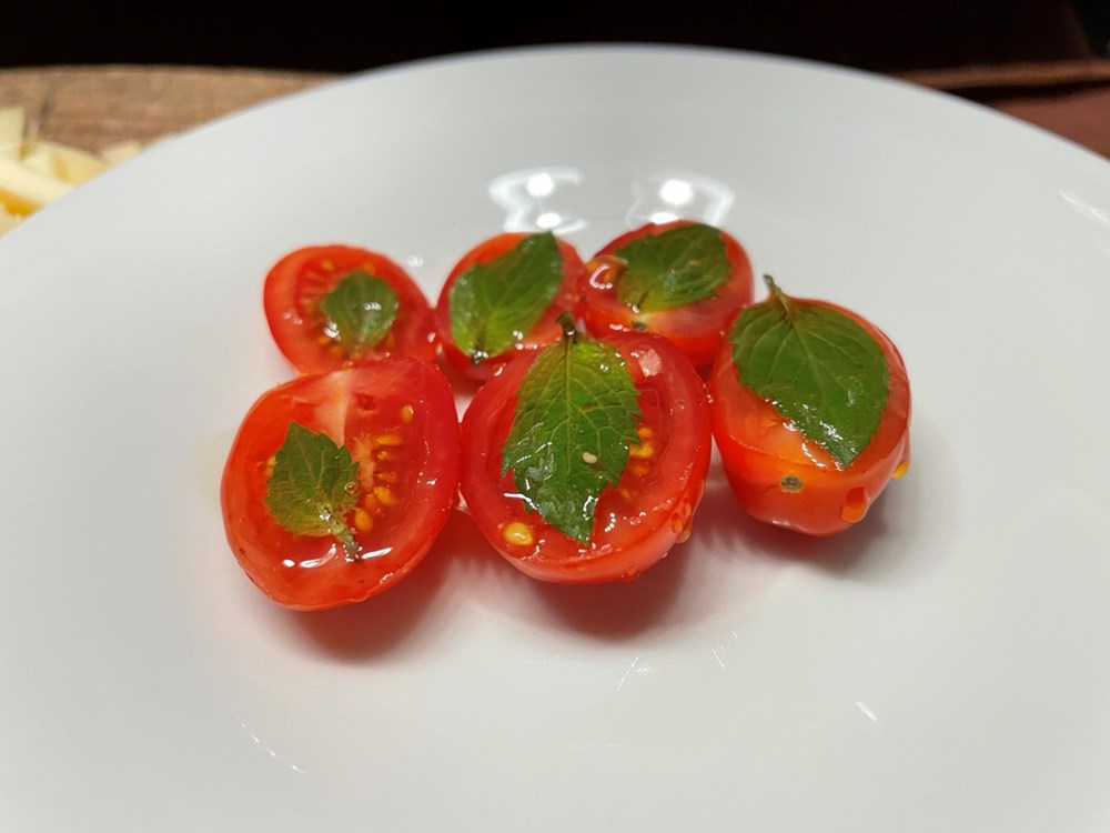 Tri cherry pomidora razrežemo oštrim nožem na polovice pa ih stavimo na manji ravni tanjur tako da prerezana strana bude okrenuta prema gore. Na svaku razrezanu polovicu stavimo par zrna cvijeta morske soli pa pričekamo minut, dva da pomidor pusti vodu i da se sol rastopi. Nakon toga na svaku razrezanu polovicu stavimo mali listić svježe ubrane mente pa zatim s punom žličicom meda prekrijemo sve polovice cherry pomidora i listiće mente… baš kao kad farbamo nekakvu drvenariju pa lakom prijeđemo površinu drva da bi ju zaštitili.