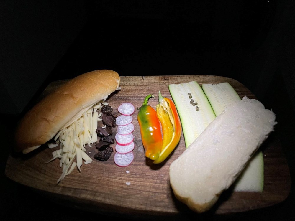 Panin razrežemo na pola, sir naribamo na krupno ribežom, slatki feferon razrežemo na pola, rotkvice narežemo na tanke fetice, tikvicu narežemo uzduž na tanke fete, maslinama izvadimo koštice… polovice planina stavimo u toster nek se peku.