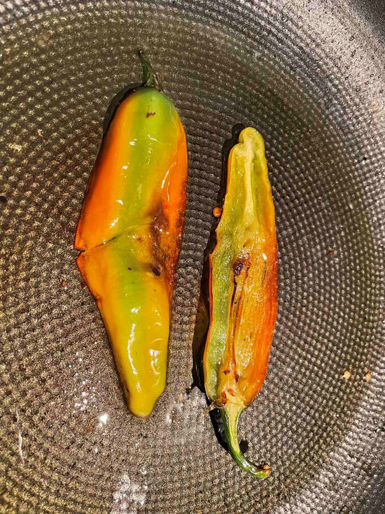 U međuvremenu u tavi na vrelom maslinovom ulju ispečemo fete tikvice i polovice feferona koje smo posolili prstohvatom soli dok smo ih pržili - pržimo tikvicu minutu i pol do dvije a feferon 2 do 3 minute sa svake strane.
