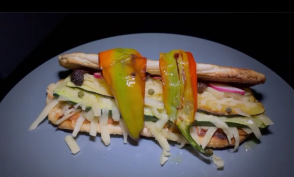 Kada mjestimice dobiju smećkaste tonove, maknemo ih s izvora topline. Donju polovicu panina položimo na plitki tanjur. Po njoj stavimo sloj naribanog sira, pa fetu tikvice, pa opet sloj naribanog sira po kojem onda posložimo fetice rotkvice, komadiće masline i par zrna zelenog papra. Na vrh preko svega stavimo dvije polovice feferona koje smo ispekli na maslinovu ulju.
