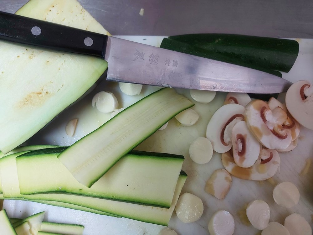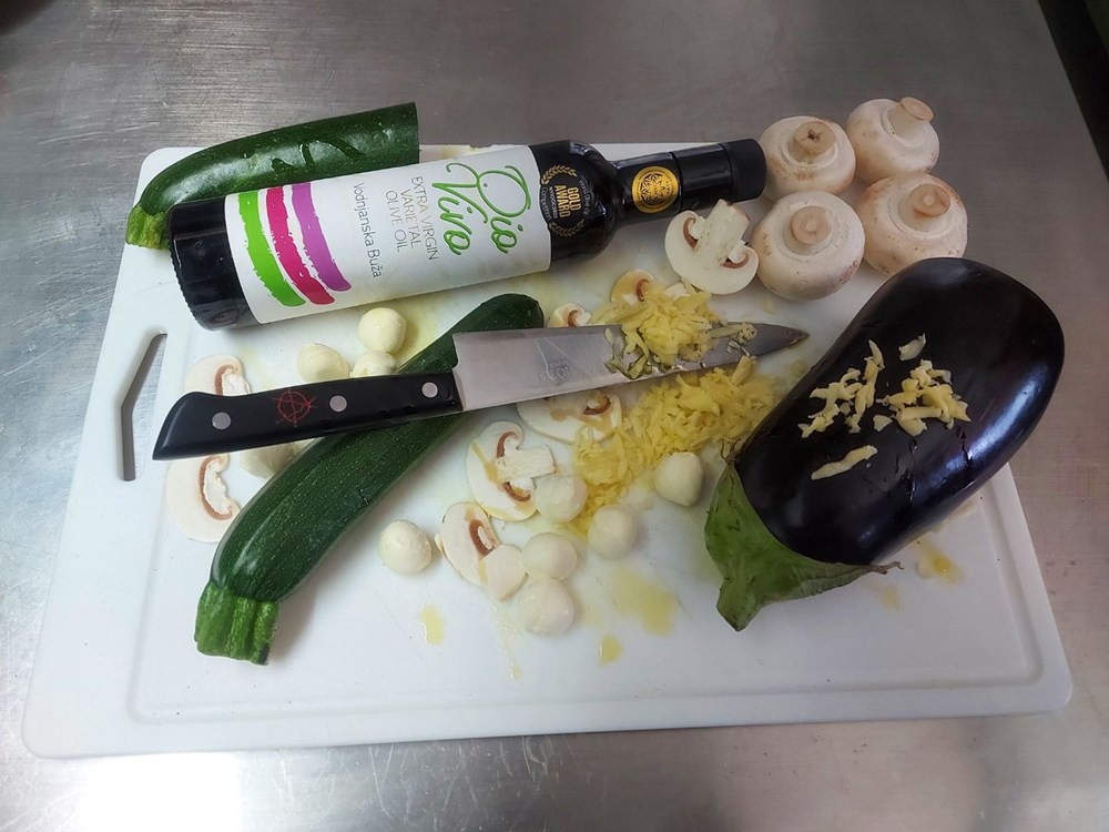 Narezati melanzan i tikvice na ploške srednje debljine. Narezati šampinjone uzduž na tanke ploške. Narezati mozzarellu na polovine a gaudu naribati u manju zdjelicu.