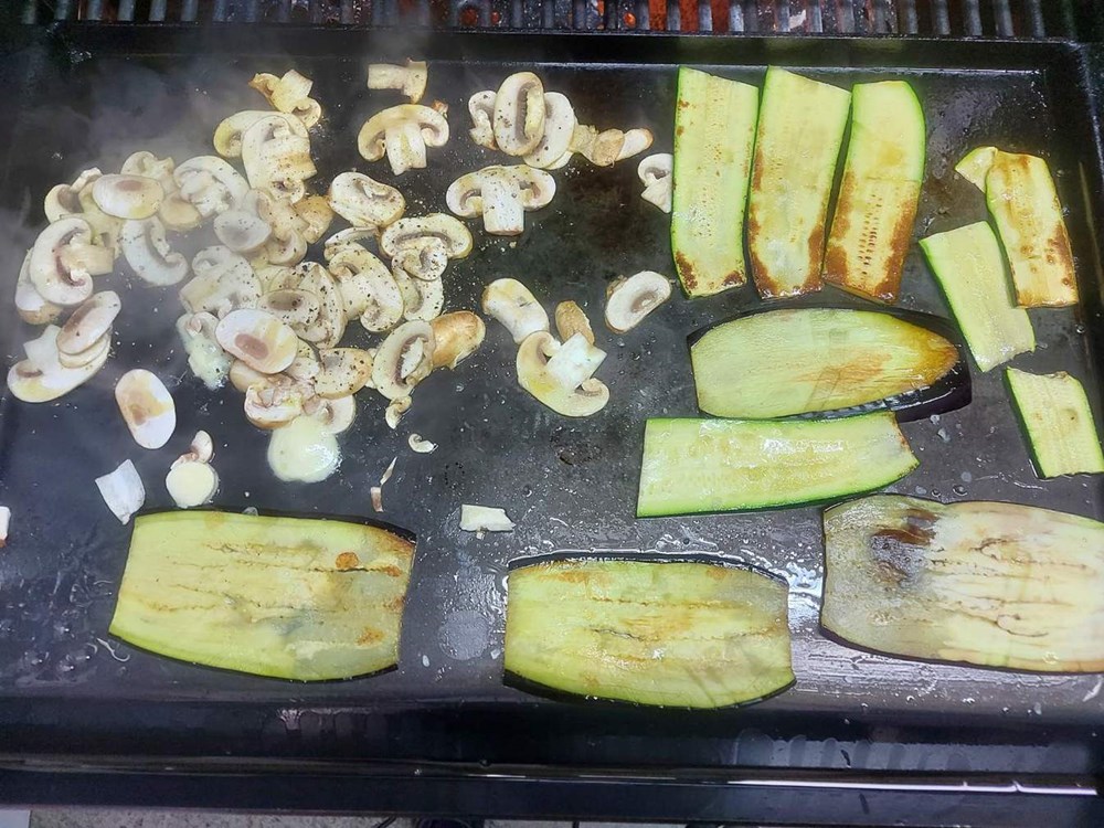 Prvo na roštilj ploči nauljenoj maslinovim uljem i prstohvatom morske krupne soli (ili na ravnoj tavi) ispecimo melanzan i tikvicu, ali samo s jedne strane dok ne dobiju lagano smećkastu koricu.