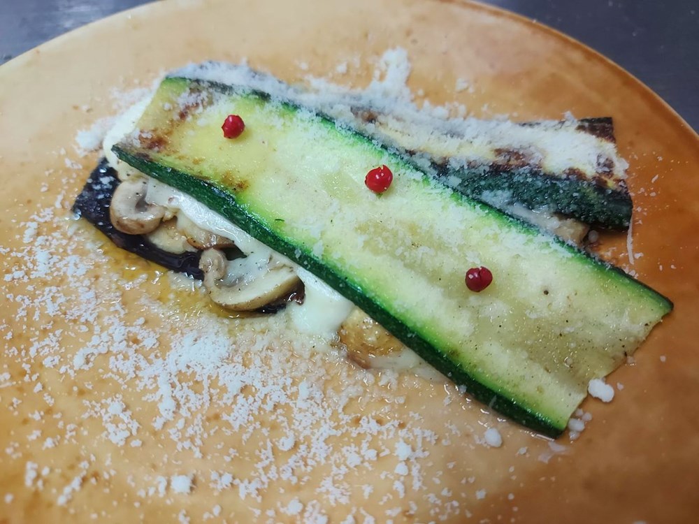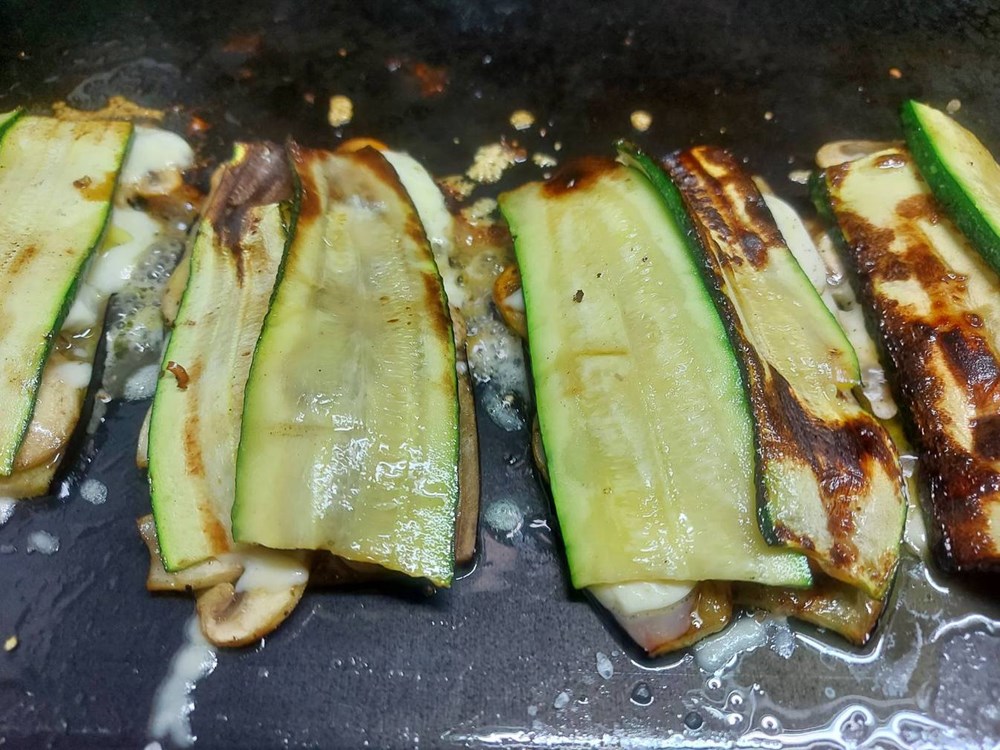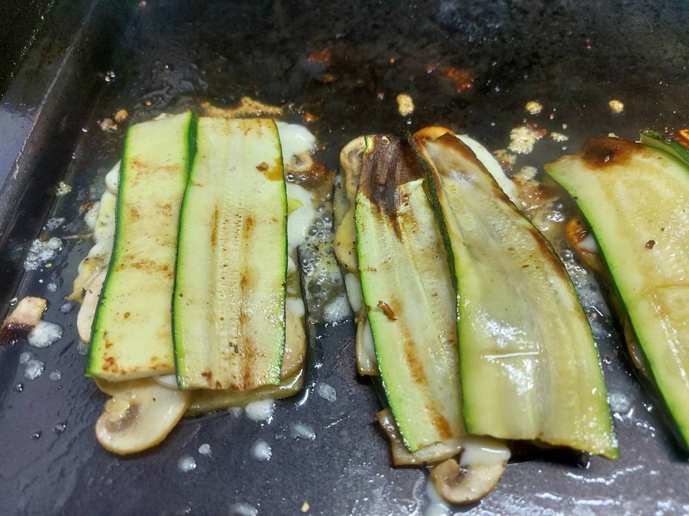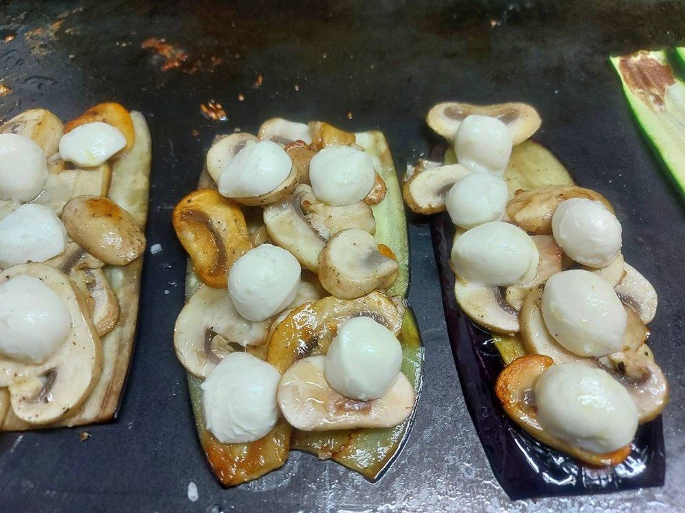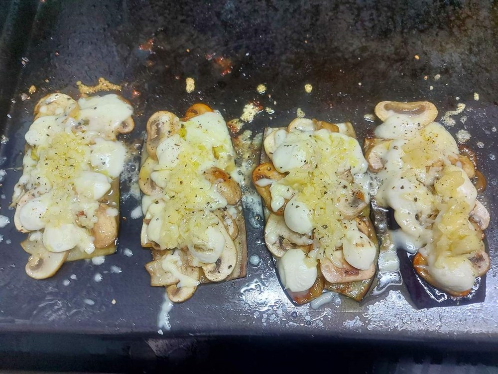 Zatim okrenemo melanzan na stranu koja je pečena i dok se druga strana peče po ovoj ravnomjerno raspodijelimo pečene šampinjone, pa zatim po šampinjonima dodamo naribanu gaudu i polovice mozzarele sira. Sve ovo prelijemo maslinovim uljem i popaprimo pa na vrh stavimo ploške tikvice koje smo pored njih pekli.