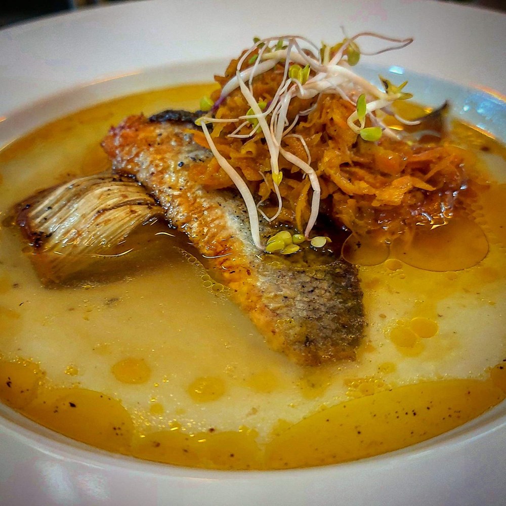 4. U međuvremenu zakipimo povrtni temeljac i dok on lagano kipi, u duboka 4 tanjura posložimo u svaki po komad prženog koromača, komad polovice filea brancina, po jušnu žlicu pržene ribane mrkve i po svakom tanjuru ubacimo po prstohvat cvijeta morske soli, pa zatim sve to u tanjuru zalijemo kipućom juhom pa dodamo po prstohvat klica rokule i poslužimo dragim gostima...