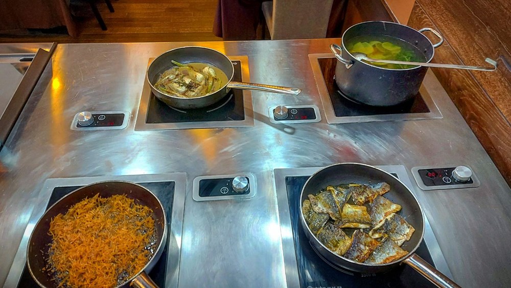 2. U prvu tavu položimo dva filea brancina razrezana na polovice, i to prvo pržimo na strani gdje je kožica, u drugu tavu stavimo dva korijena koromača razrezana na polovice a u treću tavu naribamo dvije mrkve...