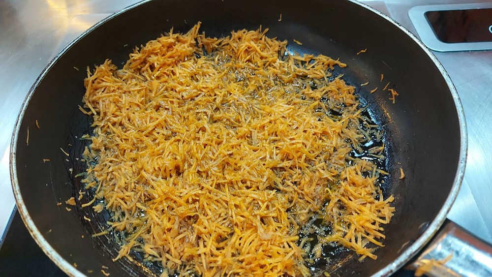 Ribanu mrkvu prvo prepržimo na ulju nekih 5 do 6 minuta pa onda dodamo kaciolu povrtnog temeljca i kuhamo na srednje jakoj vatri još nekih 45 min, ali pazimo da ribana mrkva uvijek bude gusta, kašasta, a ne vodenasta uz konstantno ali u minimalnim količinama podlijevanje povrtnim temeljcem, pa i nju zatim maknemo s izvora topline...