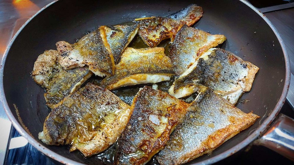 3. File od brancina pržimo s jedne i druge strane dok ne dobije laganu smećkastu koricu, pa tavu maknemo s izvora topline... koromač pržimo s jedne i druge strane dok ne dobije smećkastu koricu pa dodamo kaciolu povrtnog temeljca pa ga prokuhamo još nekih 30-ak minuta i maknemo s vatre...