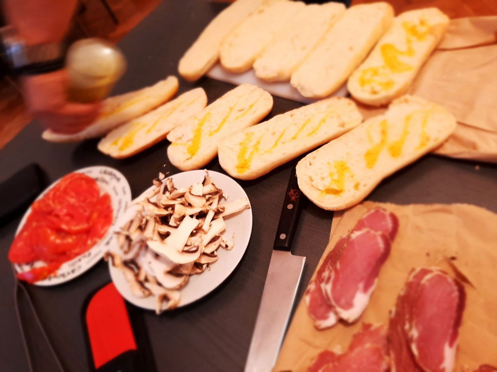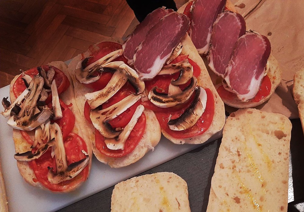 Zatim po njemu posložiti red buđole narezane na tanke fete pa i nju lagano preliti maslinovim uljem i prolaziti plamenom džepnog brenera nekih tridesetak sekundi, onda po buđoli posložiti red na tanko nasjeckanih šampinjona pa i njih proći lagano plamenom džepnog brenera tridesetak sekundi, poklopiti sendvič i pojesti ga. To je to. Dobar Vam tek...