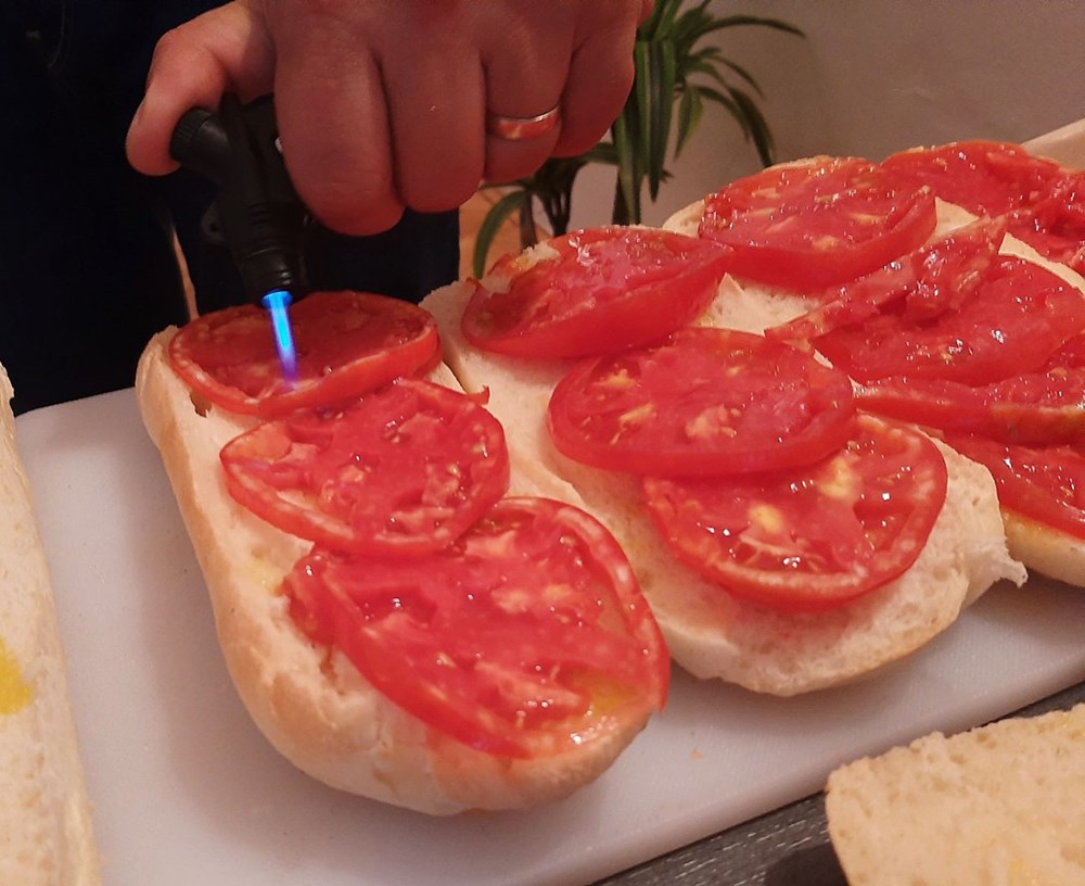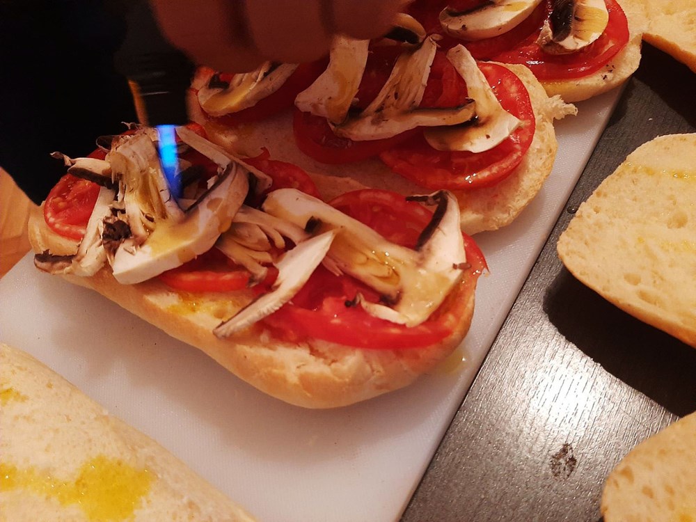 Razrezati panin na pola, u njega prvo posložiti pomidor narezan na tanke fete pa ga lagano preliti maslinovim uljem, pa zatim lagano, cca pola minute prolaziti po njemu plamenom džepnog brenera.