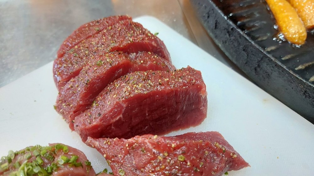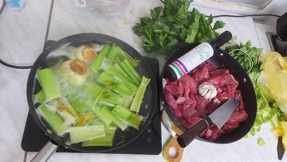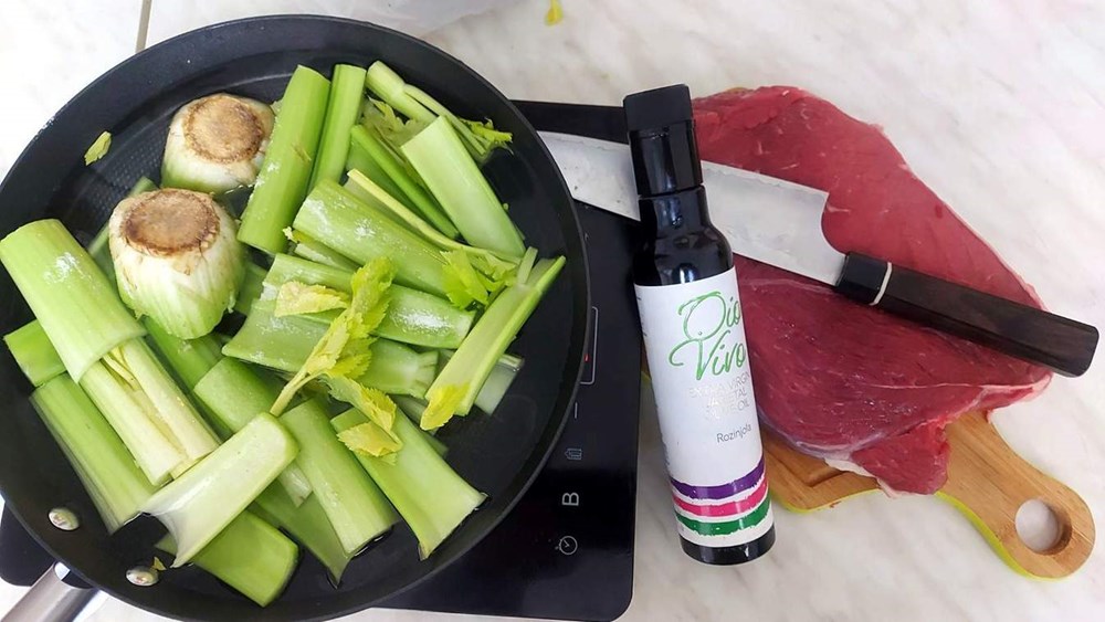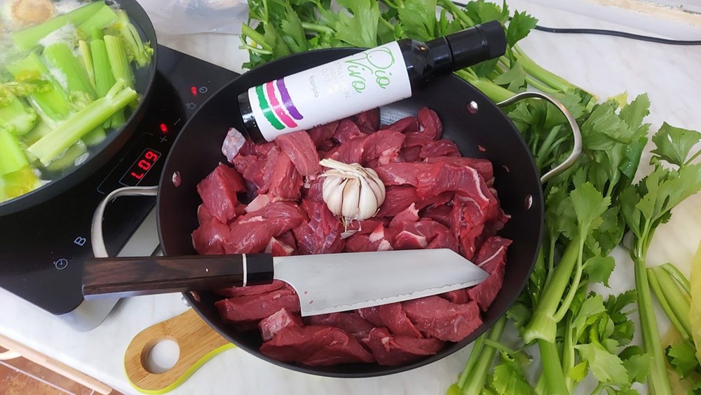 Na vrelom maslinovom ulju na roštilj ploči (ili u tavi s vrelim maslinovim uljem) bacite dva prstohvata soli, pa zatim nakon 30-ak sekundi bacite trakice junetine, a po njima nakon 1 minute bacite prutiće poriluka, mrkve i stabljike celera koje ste prethodno pržili u dubokom ulju, te ih kostantno miješajte...