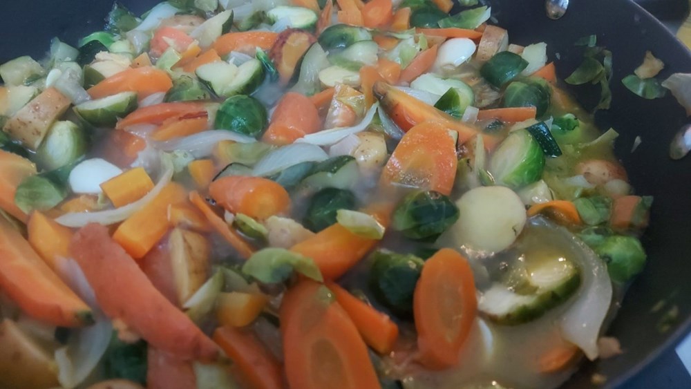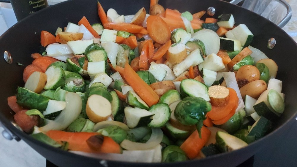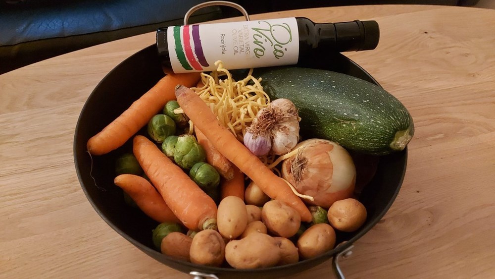 Luk izrežemo na srednje dijelove (kao za na salatu), zrna češnjaka očistimo i samo zdrobimo šakom, kelj pupčar izrežemo na polovice, tikvicu izrežemo na kockice veličine graška, sitni krumpir na ploškice (koru obavezno ostavimo na njemu) a pancetu na nešto deblje listiće.