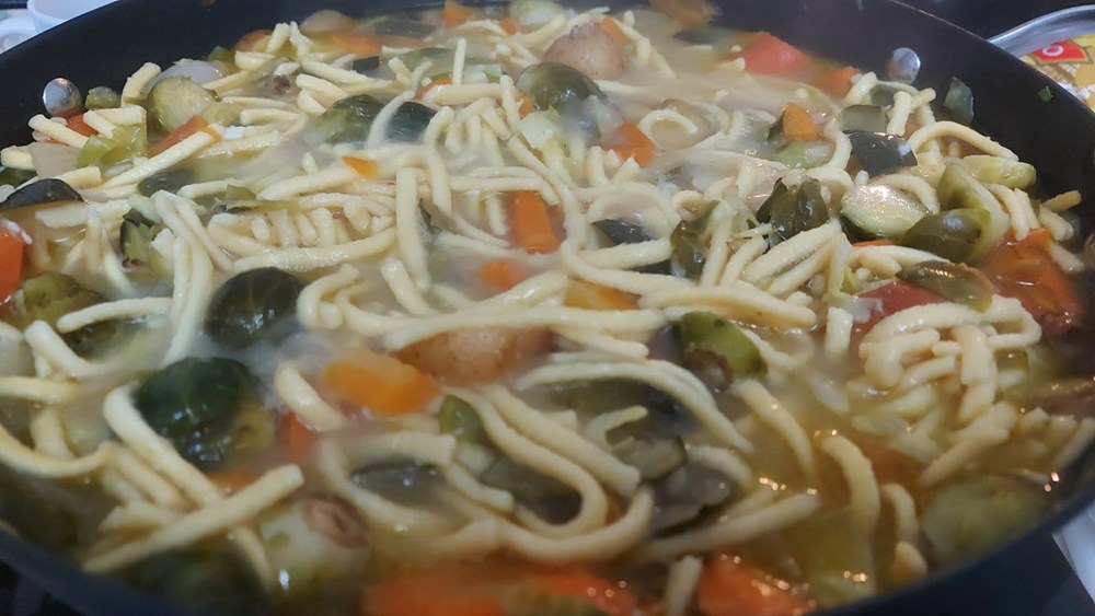 Nakon 2 do 3 minute ubacimo u lonac kelj pupčar i tikvicu na kockice, dodamo 2 do 3 dcl vode pa kuhamo nekih 30-ak minuta, zadnjih pet minuta kuhanja dodamo tjesteninu od jaja, prstohvat, dva soli i papar, pa maknemo s izvora topline.