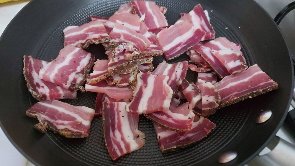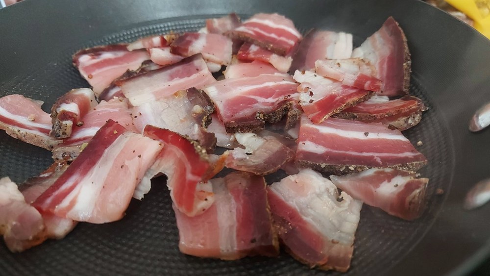 U manjoj tavi na suho prepržimo lagano pancetu dok ne postane hrskava.