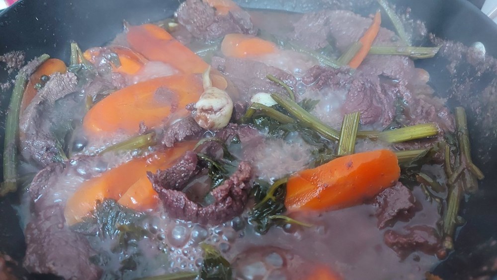 Zatim u tavu ubacimo mrkvu, narezanu na kose kolutove, pa stabljiku celera, narezanu na krupne komade, duljine 2 do 3 cm...