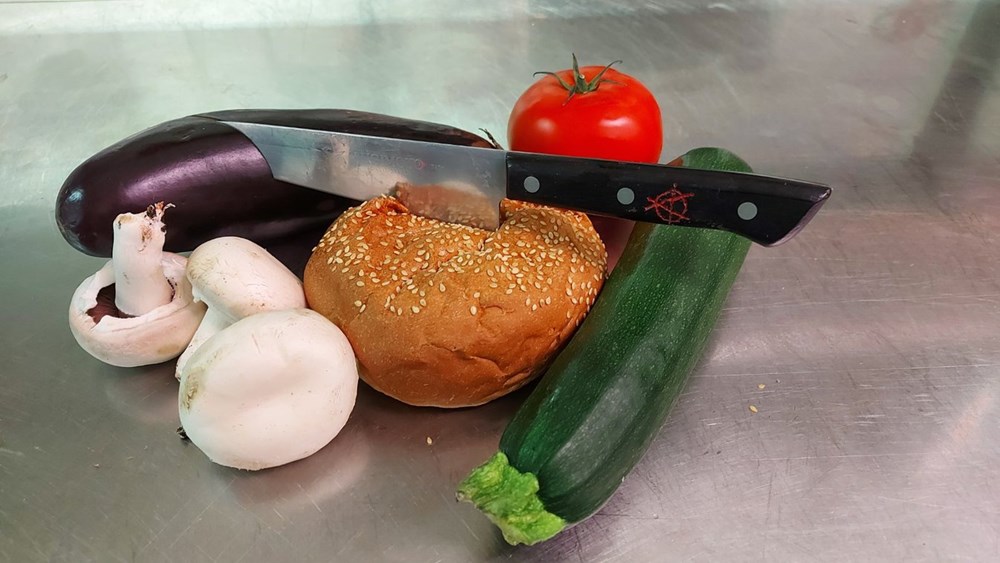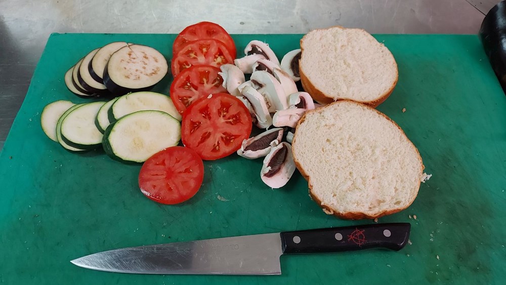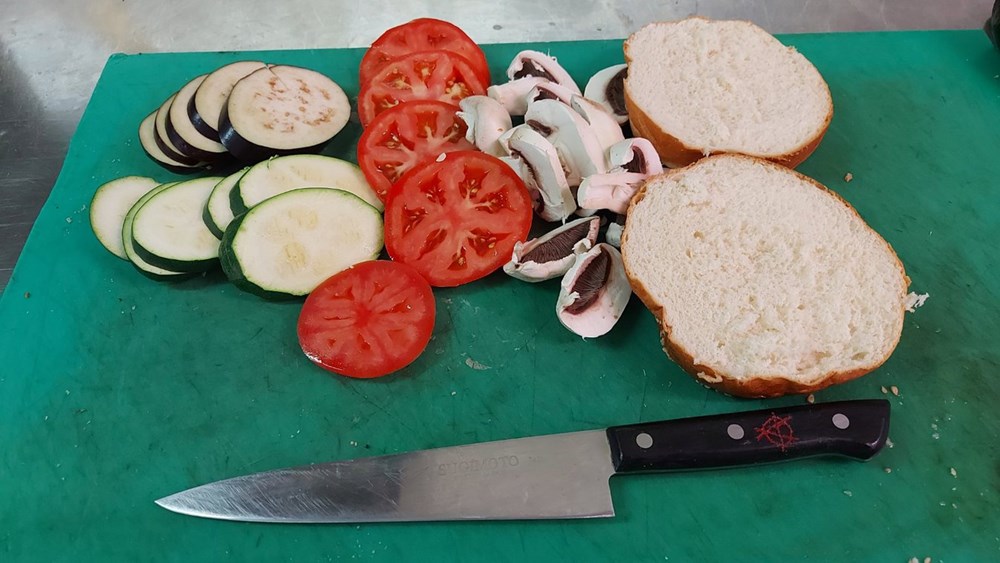 Sve maknuti s vatre pa na donju polovicu peciva poslagati povrće i gljive koje smo spekli pa poklopiti gornjom polovicom peciva...