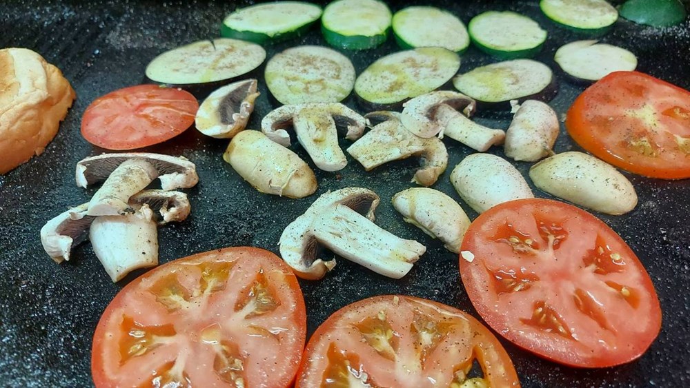 Narezati gljive, tikvicu, patlidžan na fete i staviti ih da se peku na grill tavi ili na ploči na maslinovom ulju, soli i papru...