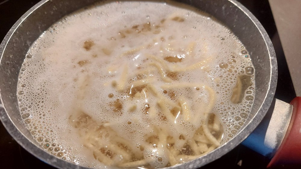 Tjesteninu (ja sam koristio rezance s jajima, ali može i bilo koja druga) skuhati u kipućoj slanoj vodi, pa ju procijediti i maknuti s vatre....