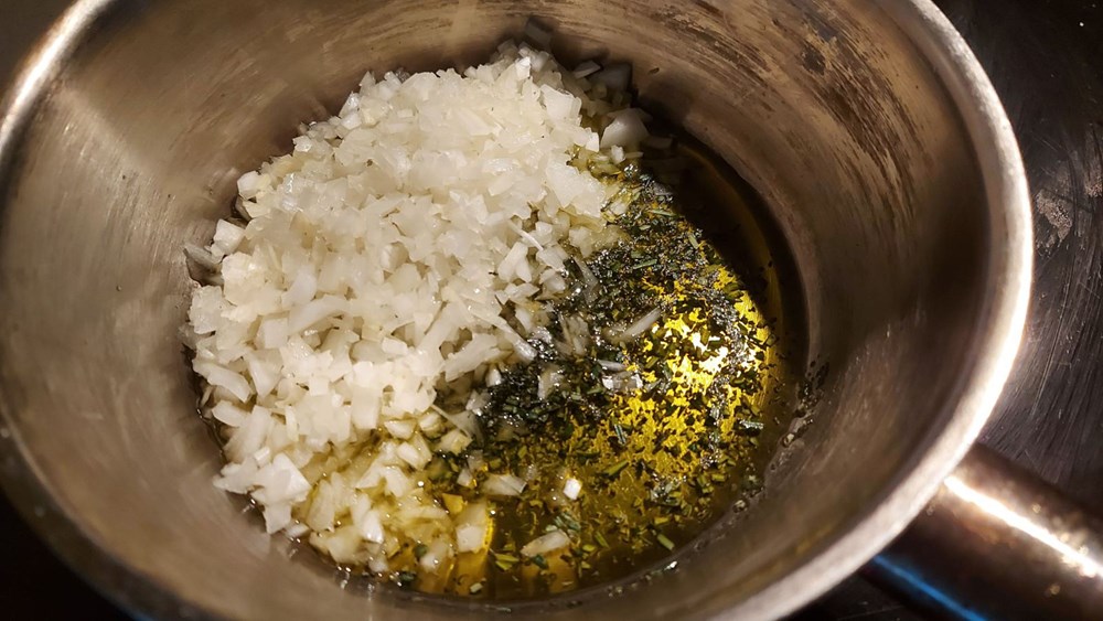 Sitno nasjeckan ružmarin i luk pržiti na cca 0.5 dcl vrelog maslinovog ulja 1 do max 2 minute, pa zatim maknuti sa vatre...