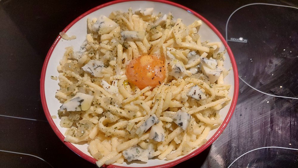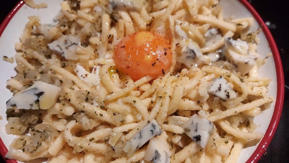 U sredinu tjestenine staviti meko kuhano jaje, pa ga prerezati žlicom da žumanjak iscuri po pašti...