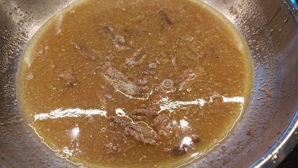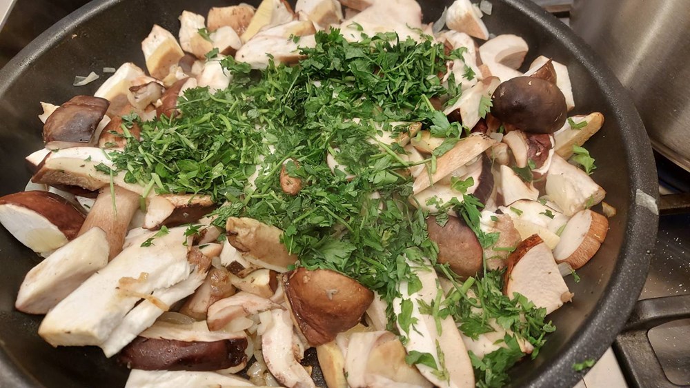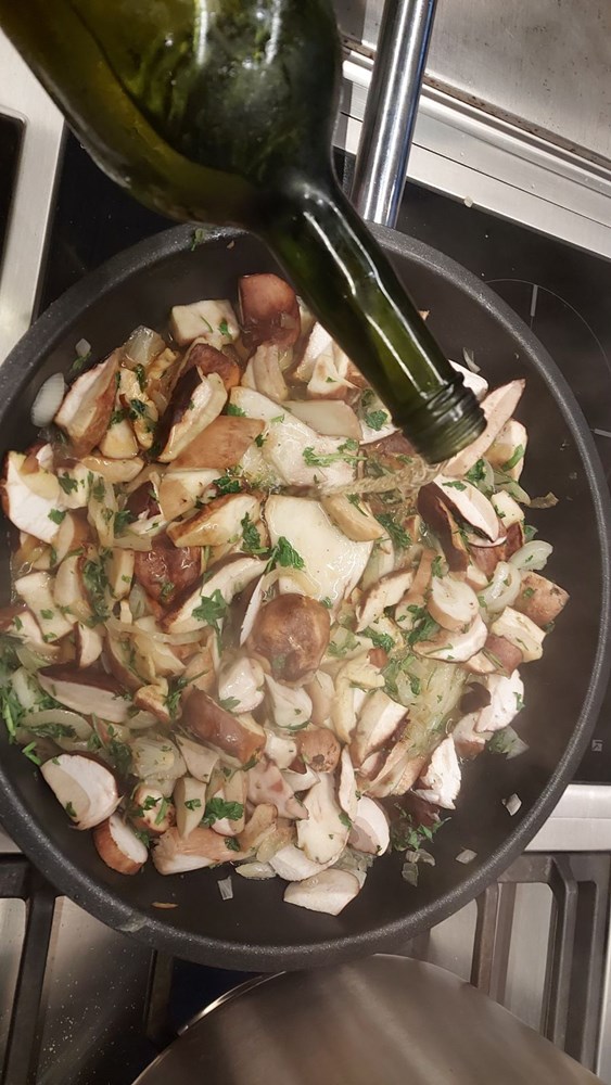 Nakon desetak minuta dinstanja dodati nasjeckani peršin i češnjak, dobro pomiješati i dodati još 1 dec vina, dinstati još nekih cca desetak minuta na srednje jakoj vatri pa maknuti s izvora topline...