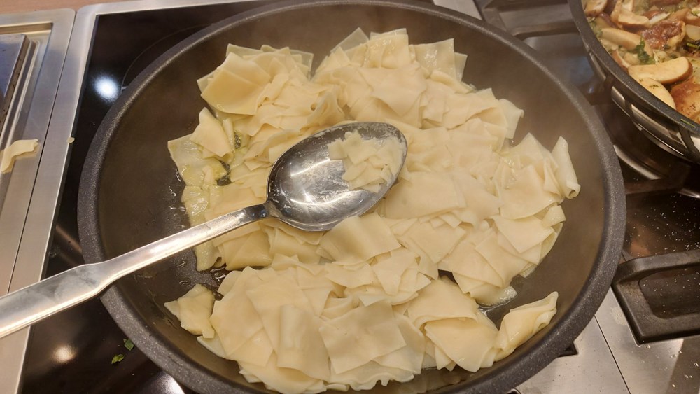 U kipuću vodu s malo ulja i soli staviti kuhati posutice, pa kad su skuhane "al dente" izvaditi ih iz vode i ocijediti, pa u tavi na maslinovom ulju i krušnim mrvicama lagano ih prepržiti cca 5 min, staviti ih po strani.