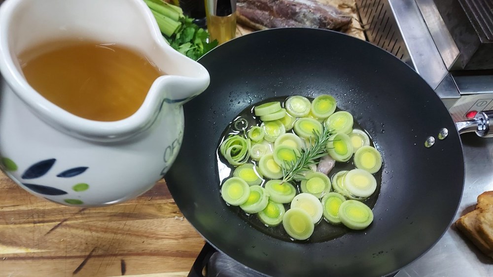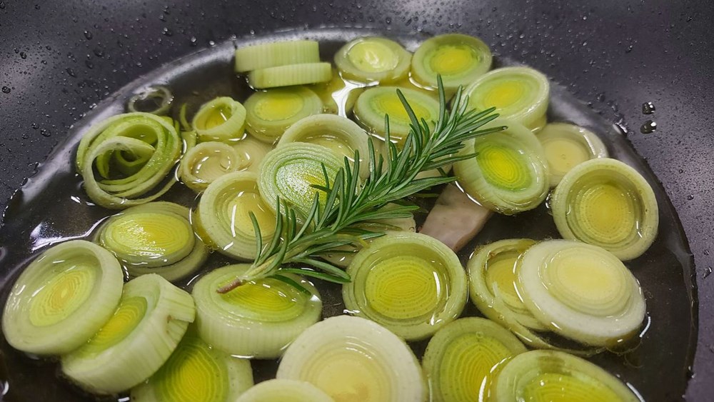 Narežemo poriluk na kolutiće te ga dinstamo 10-ak minuta na laganoj vatri na prstu čiste malvazije s par listova ružmarina.