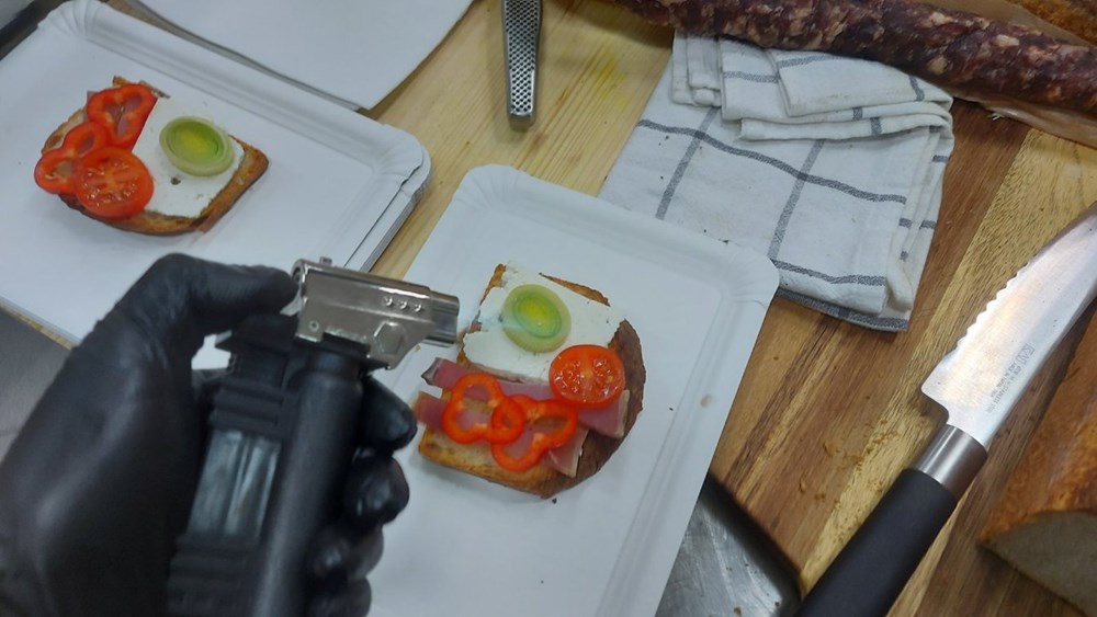 Sve ovo još jednom preliti maslinovim uljem pa proći po površini bruschetta lagano plamenom džepnog brenera, dok to radite, gledajte da i skuta djelomice po sebi dobije smećkaste tonove... i uživajte u miomirisnom dimu koji se pritom oslobađa... odmah zatim ugasite brener i zagrizite u svoj Puležanski brusket... mmm... dobar tek... volim našu Pulu!