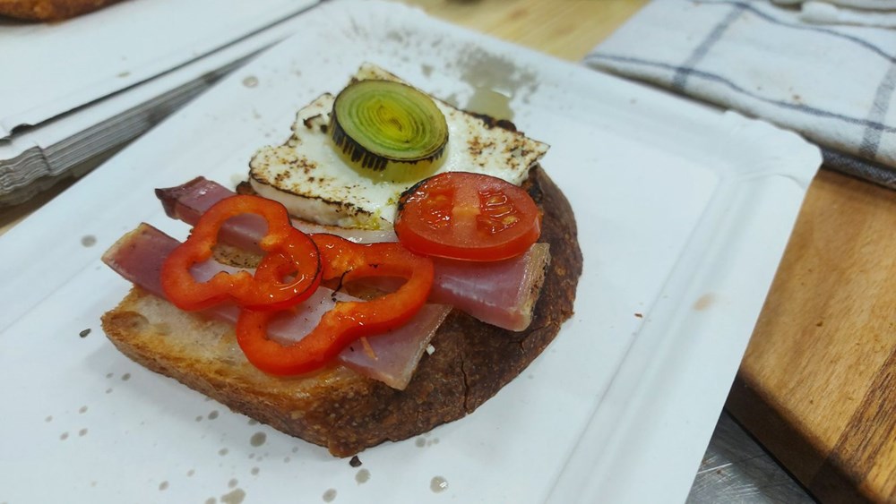 Na tu fetu kruha nakon što je dobila smećkaste tonove položimo tanku fetu skute... na jedan kraj stavimo dvije do tri trakice zarebnjaka a na drugu gore spomenuti poriluk i cherry rajčicu na fetice, te nekoliko fetica crvene paprike babure narezane na tanko...