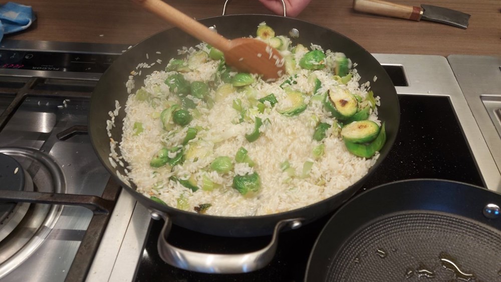 Zatim po istome principu u tavu ubacimo kolutiće poriluka, prokulu narezanu na polovice pa kad bude na pol pečena sa smeđkastom koricom sve ubacimo u lonac s rižom i sve odmah podlijemo s 1,5 dcl malvazije... uz kostantno miješanje, na laganoj vatri... pa kad vino ishlapi dodamo 2,5 dcl vode i miješamo...