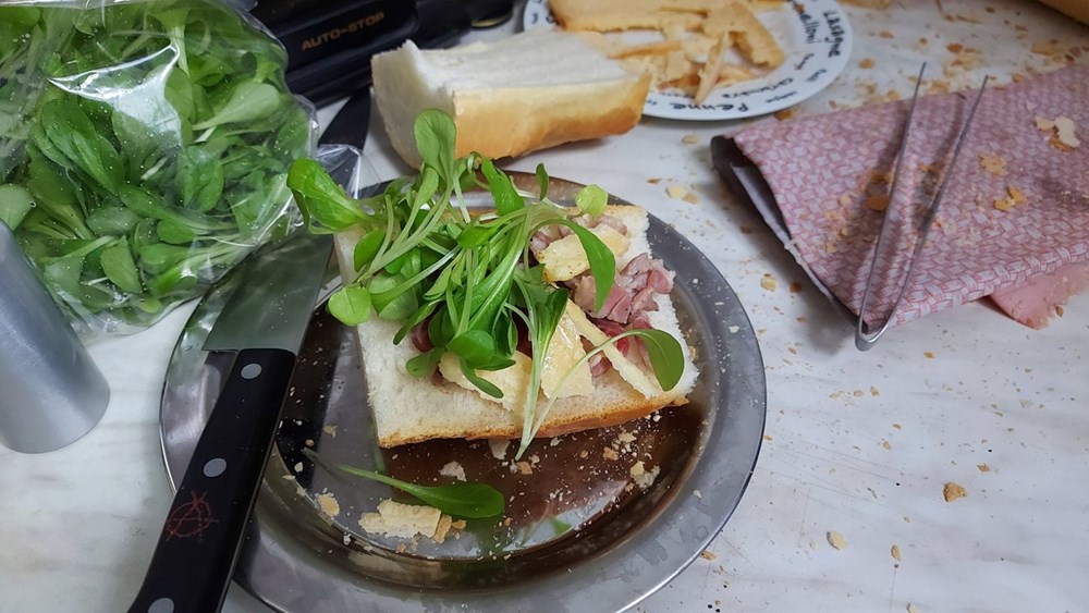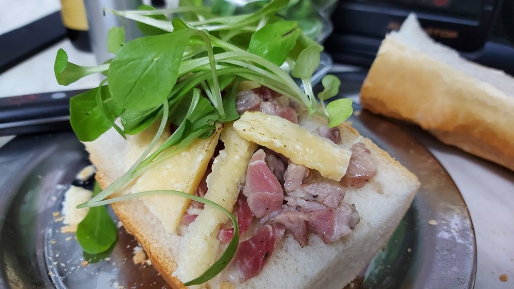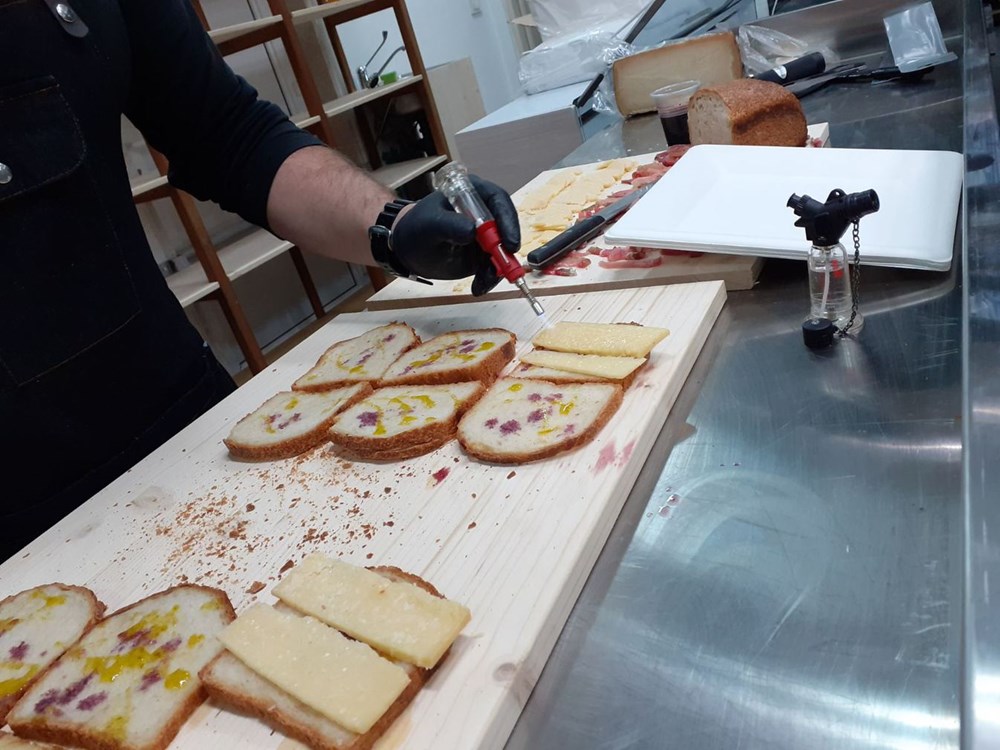 Na donju polovicu kruha posložiti trakice zarebnjaka i ovčjeg sira, malo ih rastopiti plamenom brenera pa odmah na njega staviti malo matovilca i maslinovog ulja i preko svega staviti fetu mortadele pa poklopiti drugom polovicom kruha...