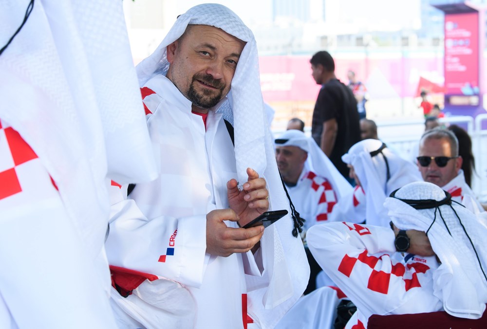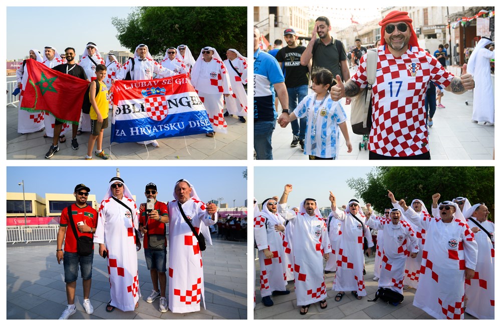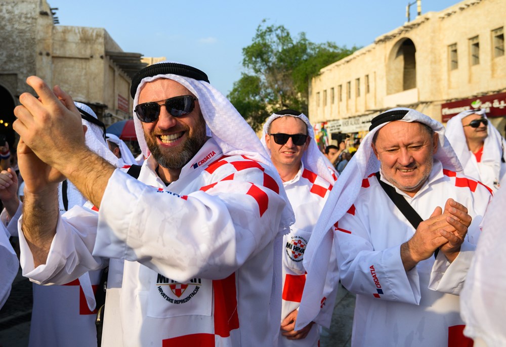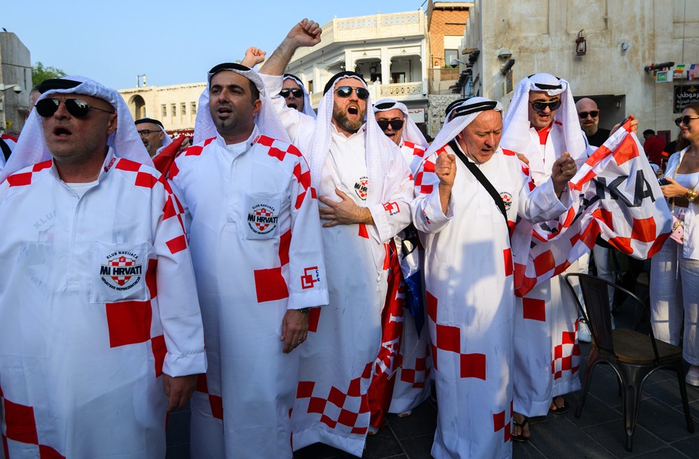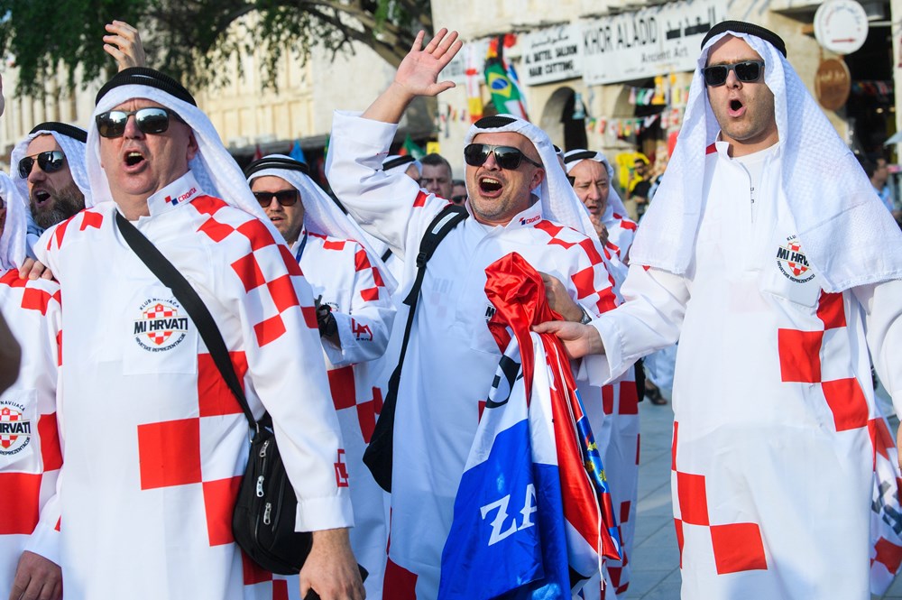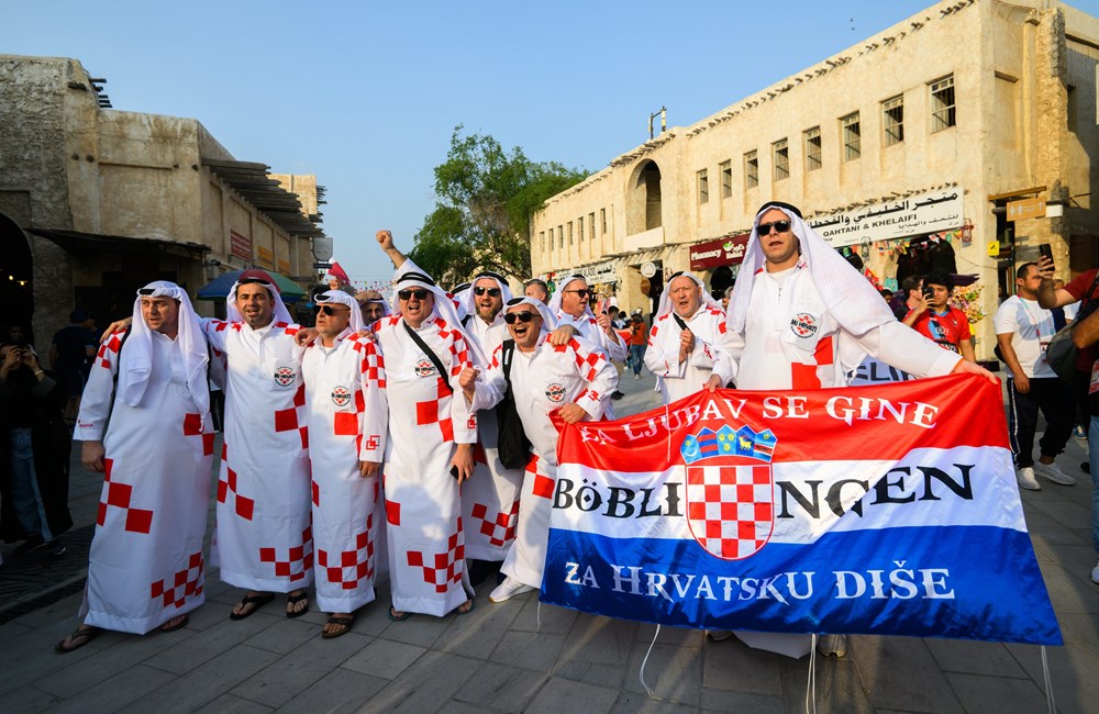 Skupina hrvatskih navijača izazvala je show u središtu Dohe, pojavivši se odjevena u tradicionalne arapsku haljinu, kanduru, ali ukrašenu prepoznatljivim crveno-bijelim kvadratićima.