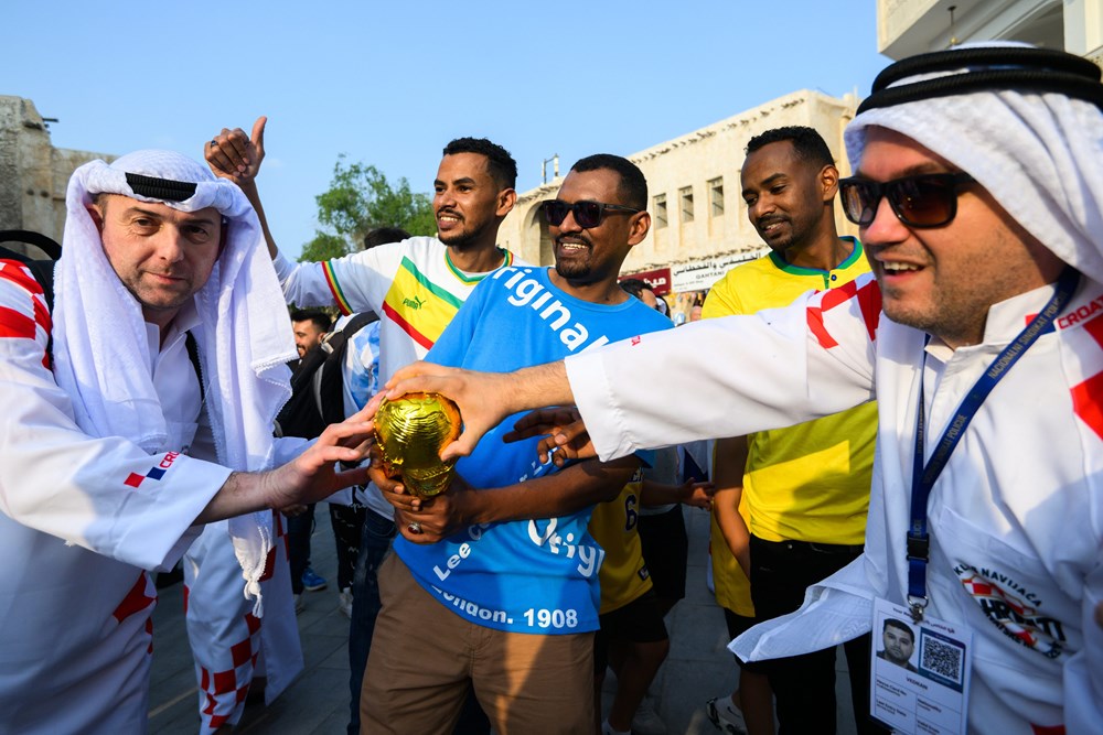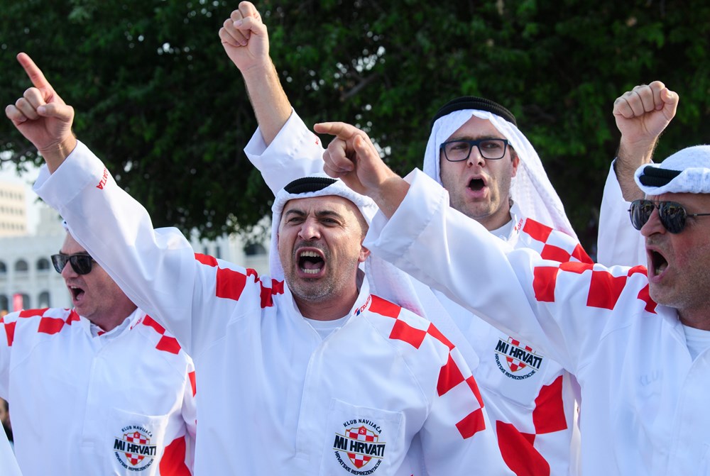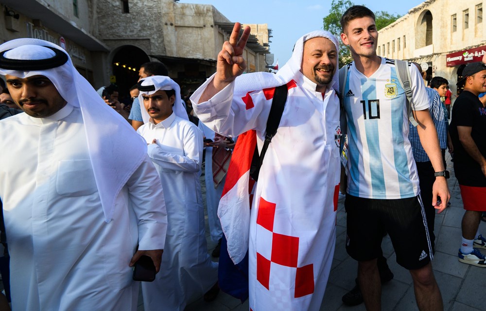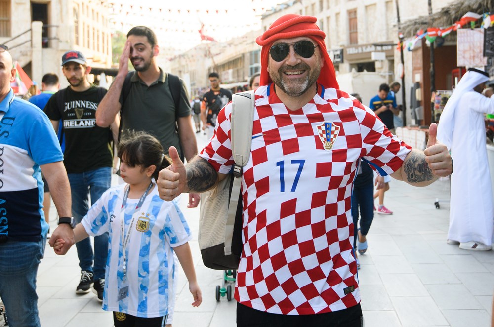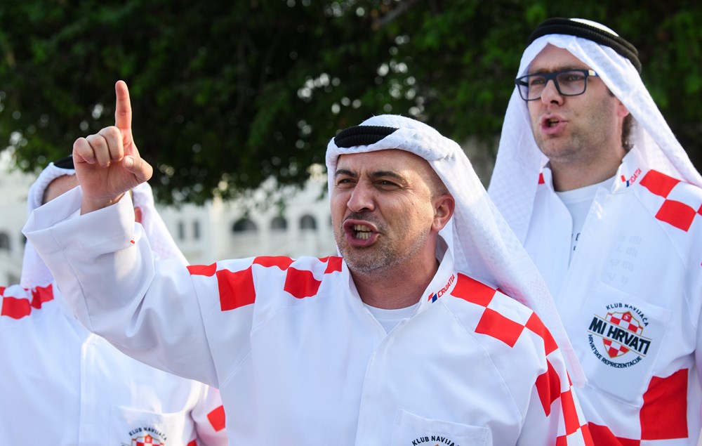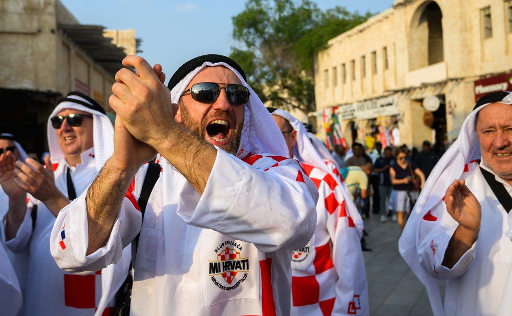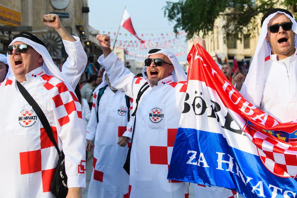 Skupina hrvatskih navijača izazvala je show u središtu Dohe, pojavivši se odjevena u tradicionalne arapsku haljinu, kanduru, ali ukrašenu prepoznatljivim crveno-bijelim kvadratićima.