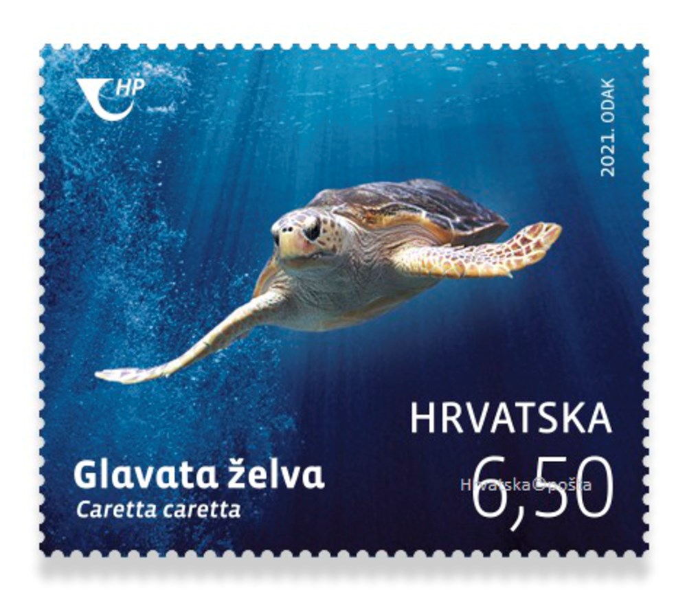 Glavata želva ili Caretta caretta (nominalna vrijednost: 6,50 kuna) najbrojnija je morska kornjača u Jadranu i Sredozemlju. Koštani ovalni oklop crvenkasto-smeđe boje može, u odraslih jedinka, biti veći od jednog metra. Glavata želva doživi i do 60 godina, a zrelost dostiže u dobi od 15 do 20 godina. Svake tri do četiri godine ženke na pješčanim plažama na kojima su se izlegle polažu jaja. Tijekom sezone polažu tri do četiri gnijezda s 80 do 120 jaja u svakom. Najvažnija područja gniježđenja glavate želve nalaze se u Grčkoj, Cipru i Turskoj. Nakon izlijeganja malene kornjače jure prema moru i idućih dana gotovo bez prestanka plivaju prema sigurnosti otvorenog mora.