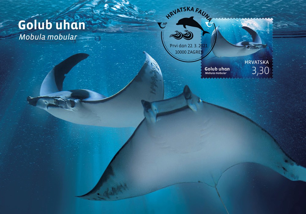 Golub uhan ili Mobula mobular (nominalna vrijednost: 3,30 kune) riba je hrskavičnjača koja spada u porodicu morskih golubova. U narodu je poznat i pod nazivom "morski vrag" zato što dvije glavene peraje ili nastavci koji se nalaze na glavi ribe podsjećaju na rogove. Golub uhan može imati raspon peraja i veći od tri metra i težiti do 300 kilograma. Obitava u pelagičkim vodama otvorenog mora. Hrani se planktonskim organizmima, račićima i sitnom ribom koje procjeđuje plivajući otvorenih usta.