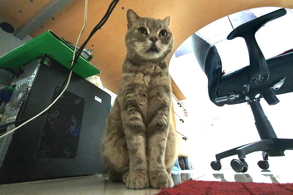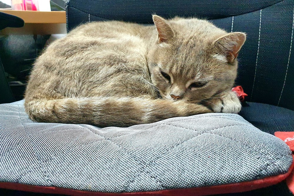 Lako smo se sprijateljili, jer je po naravi - društvenjak, vrsta - kažu britanska mačka, a apetit - ogroman. Ukratko šarmer. Ne možeš mu odoljeti. Osvojio je čak i Vasu. E, pa onda je zbilja faca. Ne pita honorar, samo mali obrok, a dolazi sedam dana u tjednu, odmah ujutro u 8 i ostaje dok se kasno navečer oko 22 sata ne zatvore vrata, a ponekad i preko noći, jer ga zaboravimo. Samo što još ne piše tekstove, premda se mota oko tipkovnica i miševa. Najviše se voli sakriti u neki kutak, leći na stolicu i odspavati između dva obroka. Nagrađuje nas umiljatim predenjem.