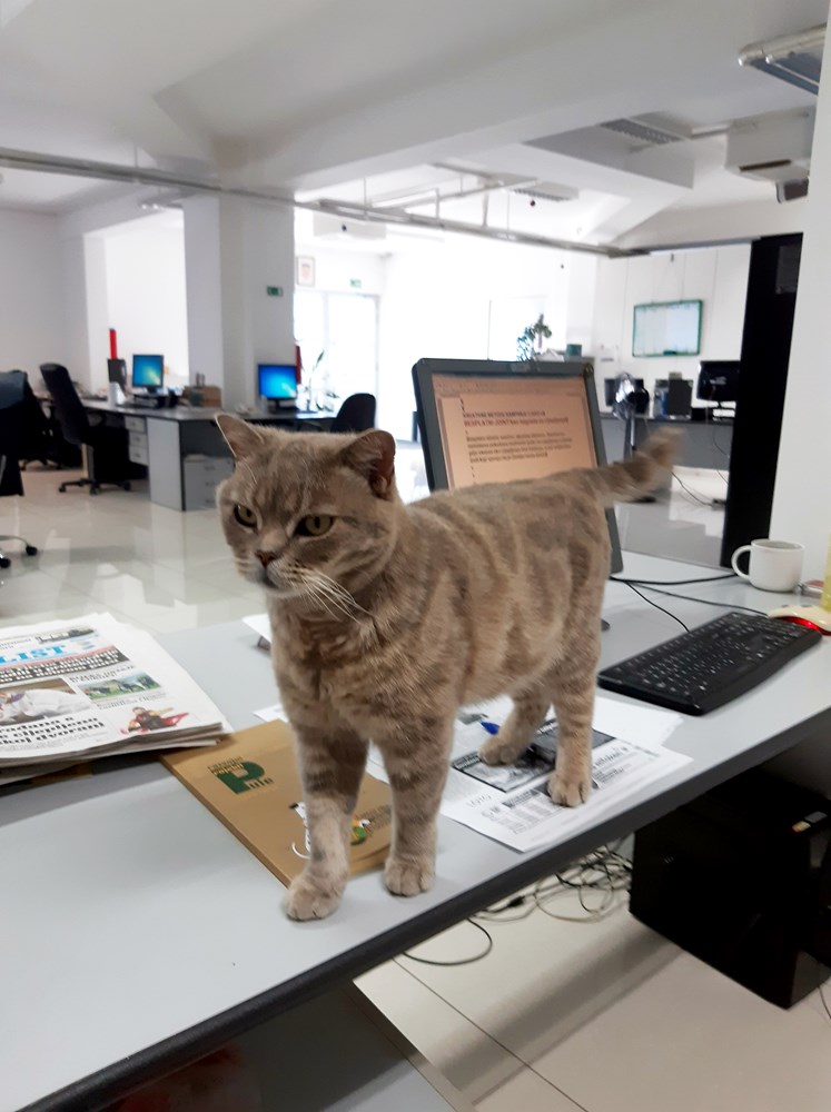 Izgleda da zaposlenicima u mnogim tvrtkama nimalo ne smetaju mačje šetnje po stolovima, stolicama, a katkada se smjeste i u kutije za dokumente, baš kao i naš Peđa. Povratak s rada od kuće u firmu donosi domaću atmosferu.