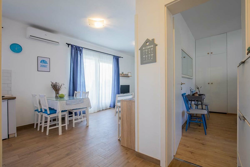 U elegantnom apartmanu konfiguracije 2+2 ležaja, uređenom u privlačnom primorskom stilu, s velikom terasom i okućnicom, kao i prostranim, čuvanim parkiralištem, oduševljava i zvučna izolacija. Tako gosti dobivaju apsolutni mir i mogućnost potpunog odmora. Mogu biti i nešto bučniji, a da nikom ne smetaju.
